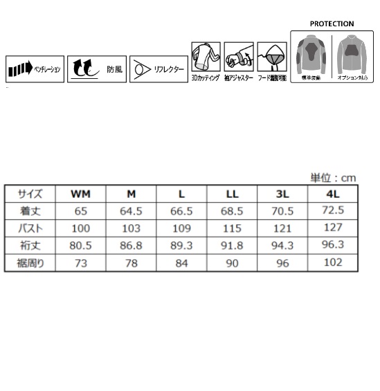 伸縮性に優れる防風生地を使用したシェルジャケット伸縮性に優れる防風生地を採用し、乗車姿勢を取りやすい立体パターンのシェルパーカ。オプションでテクセルチェストプロテクター装着可能。腕と背中のファスナー式ベンチレーションで温度調整が可能背中のプロテクターポケットには3Dメッシュを採用し、快適性を向上各所に効果的に配置したリフレクターにより、夜間被視認性を向上前腕部にバタツキ防止用アジャスターを装備フード着脱可能袖、裾はリブニット仕様表地:ナイロン80% スパンデックス20%裏地:ポリエステル100%【標準装備】脊椎CE規格プロテクター(ウレタンプロテクター)肩・肘CE規格ハードプロテクター別売りオプション対応について胸部テクセルチェストプロテクター(一体型タイプ/セパレートタイプ)に対応