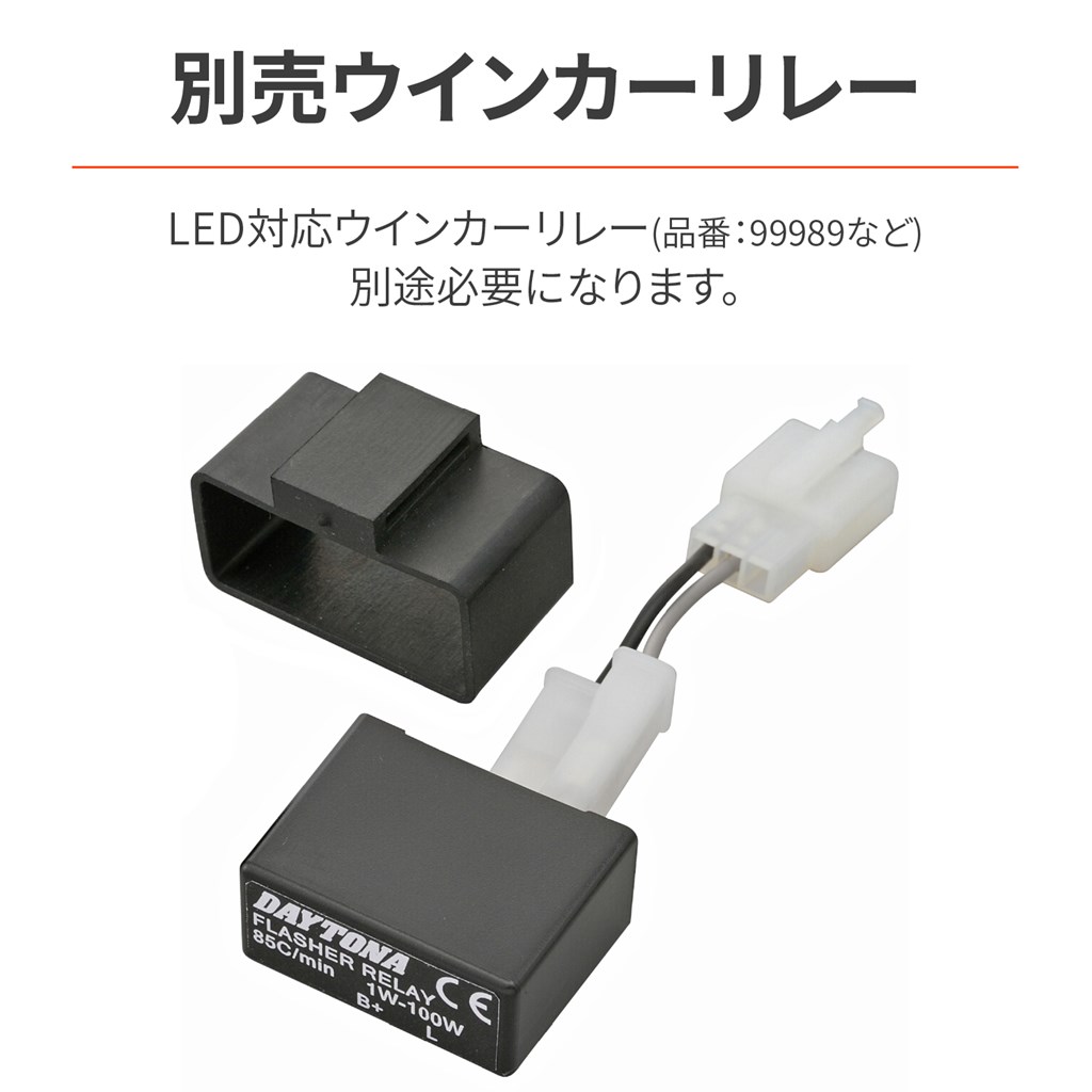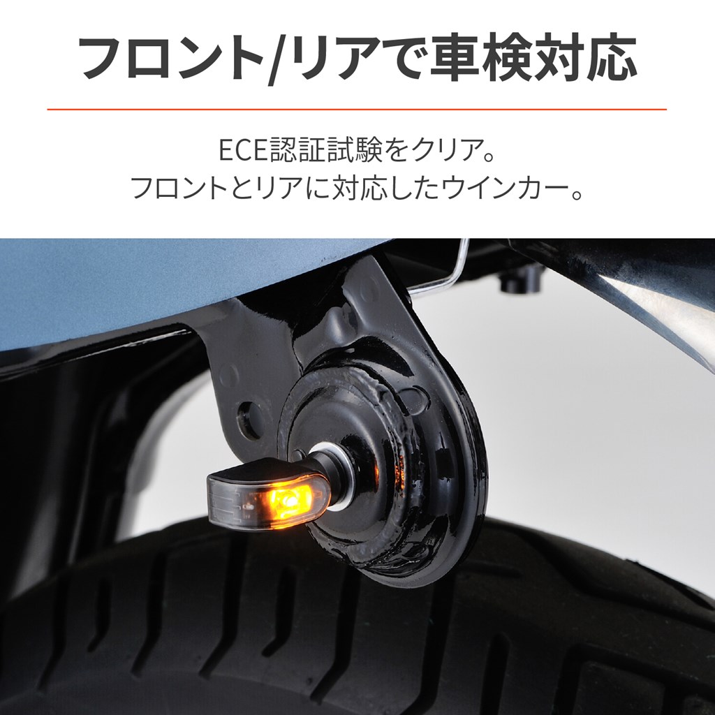 取り付け車種を選ばない小型ウインカー。高輝度LEDを採用した小型ウインカー。Eマーク取得済で安心の車検対応品。車種を選ばない小型LEDウインカーフロント、リアで車検対応 / ECE認証試験クリア防水(IP67相当)取り付け部M8×20 / 直流12Vの二輪車専用品(12V 4W)ボディ:アルミダイカスト製マットブラック※デイトナのLED対応ウインカーリレーへの交換が必要です。純正がLEDウインカーであっても、リレー交換が必要となる場合があります。※ポジション機能はありません。
