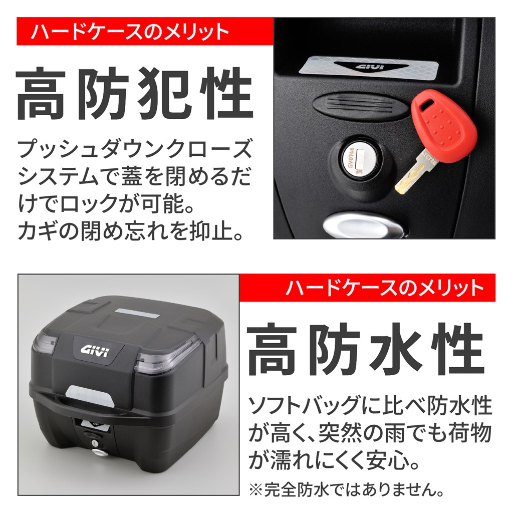 通勤・通学に最適モデル。33Lのモノロックケース。A4サイズのビジネスバッグに対応。フルフェイスヘルメット1個が入るサイズ。蓋を閉めるだけでロックができるプッシュダウンクローズシステムを採用。モノロック用の汎用ベース付属。・ボックス外寸:奥行433×幅405×高さ306mm・内寸:奥行360×幅370mm・総重量(ベースプレート込み):3.1kg・最大積載重量:3.0kg【用途】バイク用 リアトップケース(モノロック)【仕様1】A4サイズのビジネスバッグに対応、フルフェイスヘルメット1個が入るサイズ【仕様2】容量:33L、最大積載重量:3.0kg【仕様3】外寸:奥行433×幅405×高さ306(mm)、内寸:奥行360×幅370(mm)、総重量(ベースプレート込み):3.1kg【商品構成】本体、汎用ベースプレート MP60N※キャリア本体の積載制限以上は積載しないでください。※防水性を考慮した設計をしておりますが、完全防水ではありません。※構造上カギの閉じ込み(インロック)ができてしまいます。十分ご注意してご利用ください。※商品の仕様上、上下ボタンの押し込み具合は渋め(深め)です。ケースを手でささえながらボタンを奥までしっかり押し込み、確実な操作を行なってください。