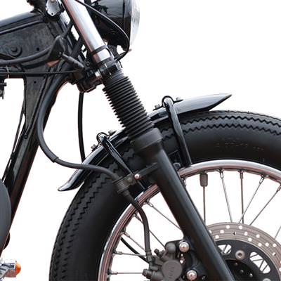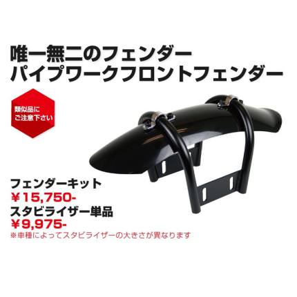 ボルトオンのフロントフェンダー。取付位置が上下でき、ファイアストーン等ハイトの高いタイヤでも装着可能。スタビライザーを兼ねたステーによるフロント剛性アップ効果もあり。今まで、ハイトの高いタイヤを装着した場合にフェンダーの装着が難しかったのですが、グッズ社のパイプワークフェンダーは問題無く装着が可能。今まで諦めていたフェンダー装着。チョッパーやボバースタイルにも違和感なく装着できるよう、出来る限りのシンプルで車体に馴染むようデザインされています。フェンダーレスで失ったフロントの剛性もこちらの商品で一発解消。サイズスタビライザー寸法:フォーク間全幅:約140mm 前後ボルトピッチ:約52mm ボルト穴径:約7mm材質:フェンダー:FRP ステー:スチール内容物:フェンダー×1 ステー×1式 パイプワークスタビライザーx1【ご注意】※取付時はフロントホイールを外す必要が御座います。※FIRESTONEタイヤは4.00サイズの併用可能を確認しております。※タイヤの種類やサイズが大きすぎる場合、装着が出来ない場合も御座います。【未塗装について】そのままの使用も可能ですが、経年による変色、薄れが出てきますので塗装される事をお奨め致します。FRP製品は製造工程上の型抜きの際などに避けることの出来ない擦れ傷が生じます。また、若干の色褪せについても「FRP製品の許容範囲内」とさせて頂きます。本品はあくまでも未塗装の状態で塗装の下地のじょうたいであるとしてご理解下さい。