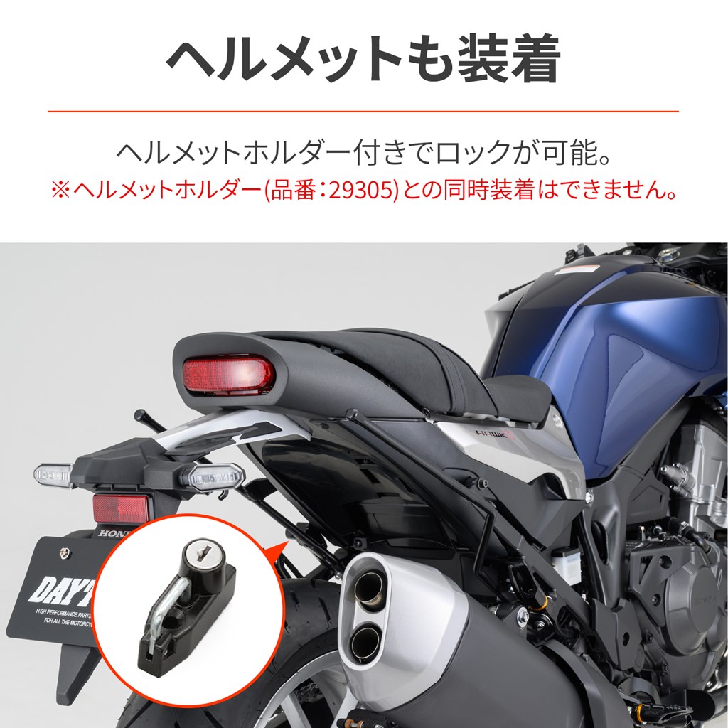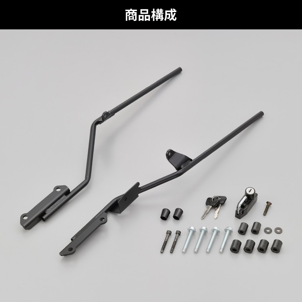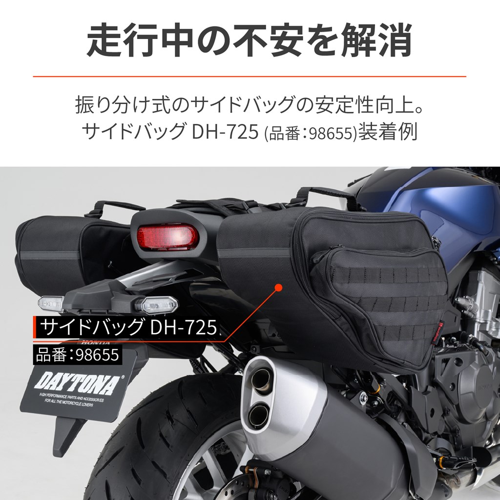 サイドバッグを装着した際の安定性を高める補助サポートバー。リアタイヤへの巻き込み防止し、走行中の不安や危険を解消。スッキリしたデザインでバッグ非装着でも、バイクのフォルムを崩さないようにバータイプを採用。ヘルメットホルダー付属HenlyBeginsのサイドバッグ DH-725(品番:98655)を推奨左右1セット マットブラック塗装