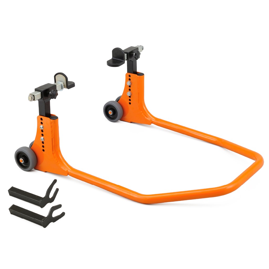 チェーン調整、リアタイヤを取り外す作業などリア周りのメンテナンスには欠かせないリアスタンドです。新形状フレームと鋳造アームの採用により安心の剛性感。リフトアップ時にはローラーが浮いてフレームが接地する構造にすることで、作業時の安定感が向上。L型とU型アタッチメントを標準装備し、アタッチメント幅は無段階、高さは9段階の調節が可能です。車両に合わせて適切な高さでリフトアップできます。・幅(無段階) L型:260-390mm / U型:260-410mm・高さ(9段階) L型:218-319mm / U型:242-343mmスイングアームとスプールに対応したバイク用リアスタンド高さ9段階と幅の無段階調整により幅広い車種に対応作業時に安定するように、リフトアップ時にはローラーが浮いてフレームが接地対応スプール径:φ14-18mm耐荷重:200kg※左右で段違い等のスイングアームには使用できません。U型アタッチメントを使用する際は別途スイングアームスプールを購入する必要があります。