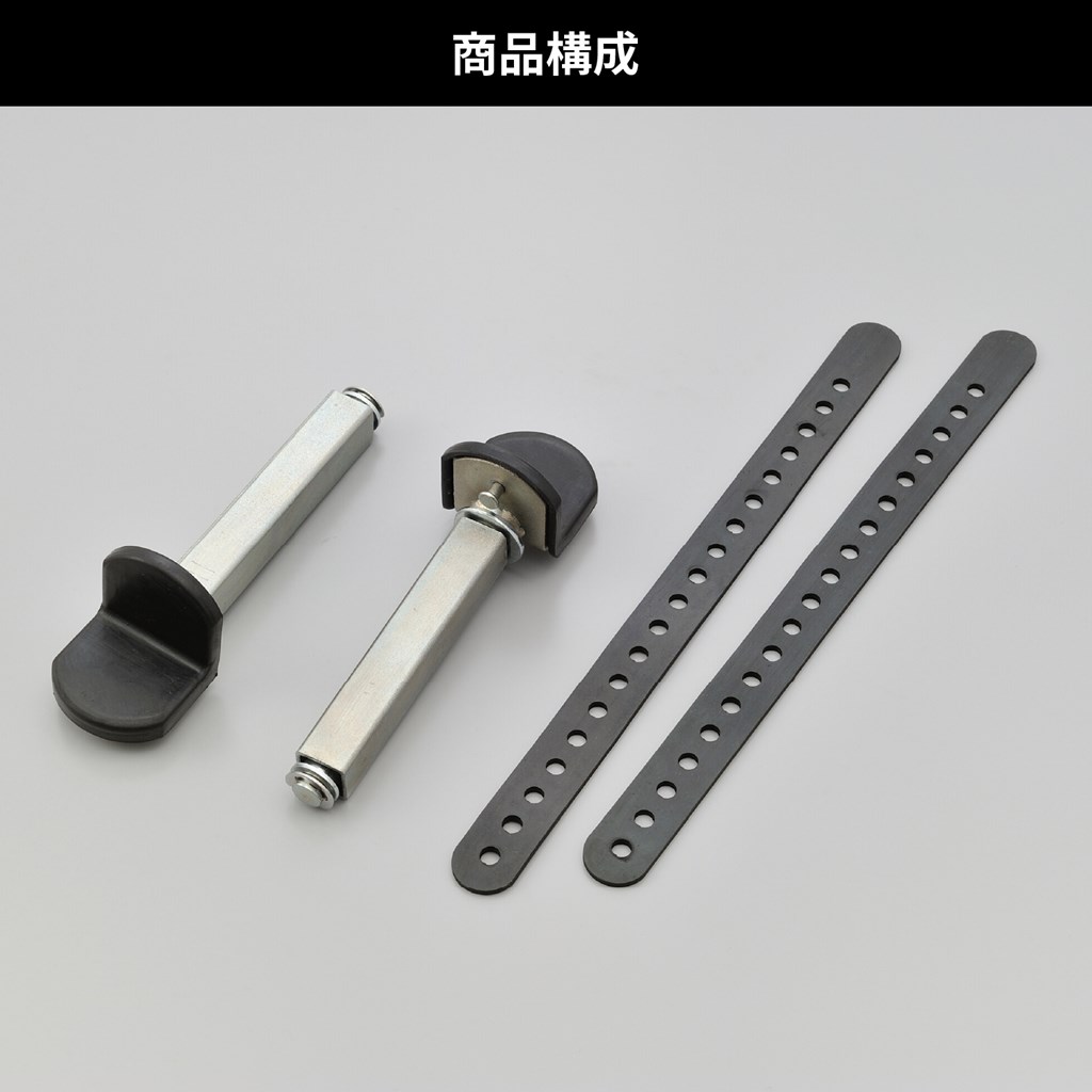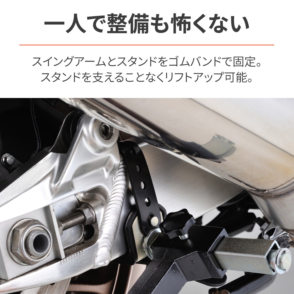 リアスタンドアジャスタブルシリーズ(品番:21096/27934)とワンタッチリアスタンド U型クランプ(品番:30207)のオプションパーツとして使用できるアダプター。一人でL型アタッチメントを使用してリアスタンドを掛けることに不安がある方にオススメ。L型アタッチメントに装着されているゴムバンドをスイングアームに巻くことでリアスタンドをスイングアームに固定。スタンドを支えることなく簡単にリフトアップ。また、バンドで固定されているため、スタンドから降ろした際にもスタンドが落下しなくなります。スタンドを支えることなく一人でも簡単にリフトアップリアスタンドアジャスタブルシリーズ(品番:21096/27934)とワンタッチリアスタンド(品番:30207)のオプションアダプタースイングアームにゴムバンドを巻くことでスタンドを固定スタンドから車両を降ろす際にもスタンドが落下しない