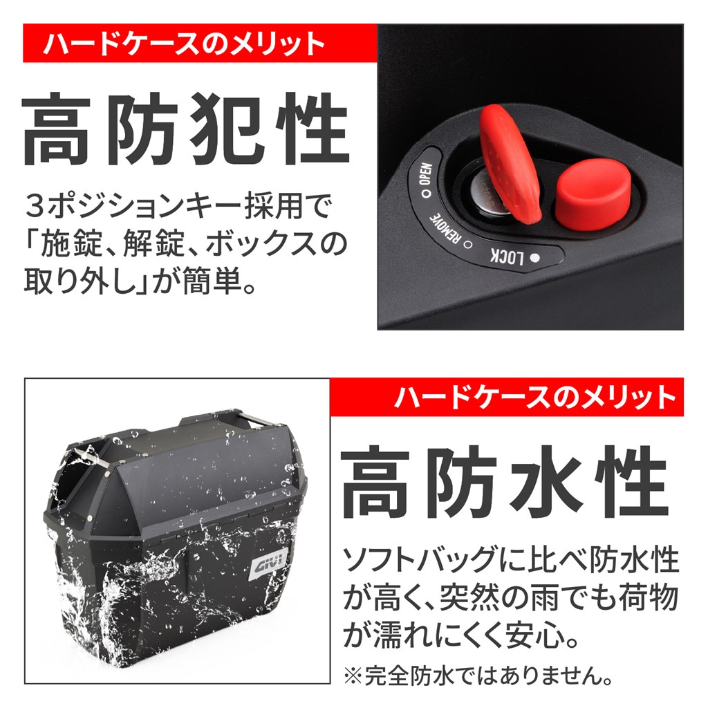 「OPEN」「REMOVE」「LOCK」の3ポジションキー方式を採用した、シャープなデザインのGIVIサイドケースの左右セット。軽量な耐UV性の樹脂素材のため、Vストローム250やVersys250のようなミドルサイズのアドベンチャーバイクにおすすめ。日本限定エンブレム採用。別売のPL/PLR/PLO-MKパニアホルダーに適合します。Vストローム250やVersys250のようなミドルサイズのアドベンチャーバイクにおすすめのサイドケース容量:23L(片側)、最大積載重量:5kg(片側) 操縦性を考慮し2kg以下推奨サイズ(外寸):奥行221×幅468×高さ356mm 、片側重量:1.9kg適合フィッティング:PL/PLR/PLO-MKパニアホルダー日本限定エンブレム採用※デイトナでは操縦性を考慮し2kg以下(片側)を推奨。※トップケース用セイムキー&シリンダーセットは付属しません。※左右サイドケースにはあらかじめセイムナンバーキー(内溝タイプ)組み付け済み。※フィッティングの積載制限以上は積載しないでください。※PL、PLR、PLO-MKシリーズのパニアホルダーにしか取り付けできません。※PLO-MKは車両によって取り付け時に蓋が閉まりにくい場合があります。※防水性を考慮した設計をしておりますが、完全防水ではありません。