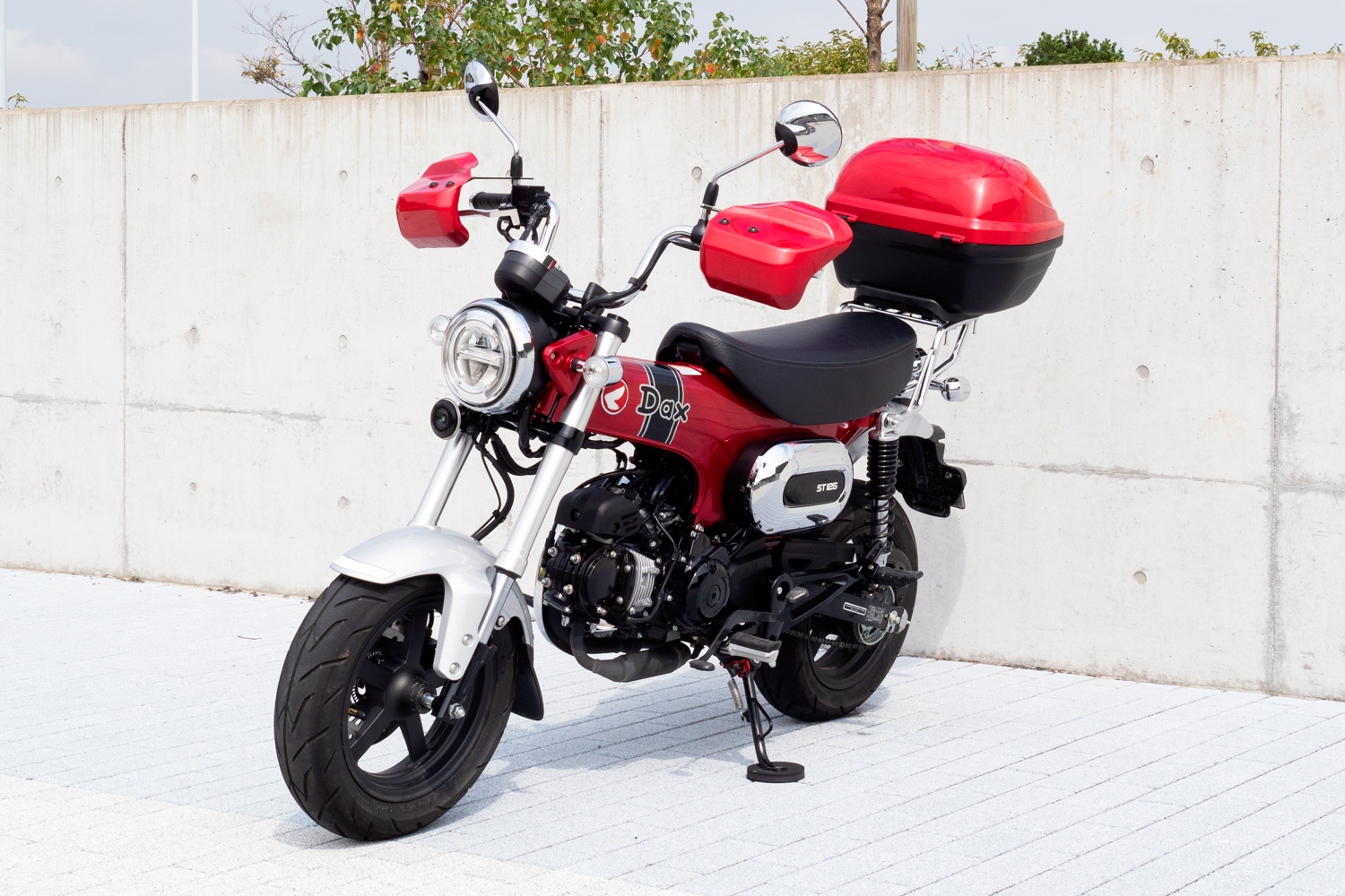 ・カラー:パールネビュラレッド・素材:高強度ABS・付属品:ボックス本体/リアキャリア/取り付けボルトセット一式/取扱説明書・外寸:460mm×400mm×330mm・容量:32L大好評の塗装リアボックスのシリーズに、この秋新型として登場した「ダックス125」純正色塗装仕上げのリアボックスです。素材はワールドウォーク製のリアボックス共通の高強度ABSを採用し、「大人が乗っても壊れない高強度のリアボックス」が実現しました。32Lという汎用性の高い容量で、開閉もワンタッチでできるプッシュロックタイプを採用。見た目だけではなく強度・使い勝手も抜群です。純正色を限りなく再現純正色の調色データは公開されておりませんが、限りなく近い色に再現。光が当たっているときに見えるパール粒の大きさも揃えています。ベースには蓋を付属リアキャリアにベースを装着した際に露出するボルト類を隠す蓋を付属。ベースからリアボックスを外した際の見た目にも配慮しています。固定に使うナットはセルフロックタイプ荷物をいれるリアボックスは絶対に外れてはいけません。ベース固定用のナットは緩み止めがついたセルフロックナットを付属しています。開閉が簡単なプッシュロックタイプフラップ式よりも開閉が簡単なプッシュロックタイプ。開け閉めの際に「コツ」はいりません。鍵は予備付開閉の為の鍵は2本附属します。仮に一本紛失してしまっても、予備鍵で開閉可能です。ベースに防震ゴム走行中にガタツキがないようにベースには四箇所防震ゴムを採用しています。手作業での塗装塗装色は多くの色を組み合わせて純正色を再現しております。塗装作業はと乾燥を3度繰り替えす3コート塗装で仕上げており、非常にクリエイティブな作業です。受注生産にてお承りしている為、お届けまでにお日にちを頂戴しておりますが、確かな技術で仕上げたリアボックスは愛車とほぼ同じカラーに塗装され、多くのお客様からご好評頂いております。リアボックス淵部分にトリムシールリアボックスは設計上、蓋を閉めても多少の隙間ができてしまいます。隙間からゴミや雨水が入りにくくするためにトリムシールを装備し、できる限り隙間が出来ない構造に仕上げております。本体素材は高強度ABS。女性が二人乗っても壊れません!※写真はサンプルにつき色が異なります。※デザイン・仕様は予告なく変更されることがございます。予めご了承ください。※ご自身でお取り付けを行った場合はいかなる場合も保証の対象外となります。ご理解頂きますようお願い申し上げます。※本製品をDax125にお取り付けする際はセット販売のリアキャリア、もしくはその他ベースの取り付けが可能なリアキャリアを装着の上、お取り付けください。※本製品は受注生産となっております。