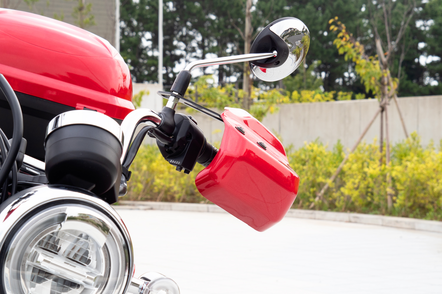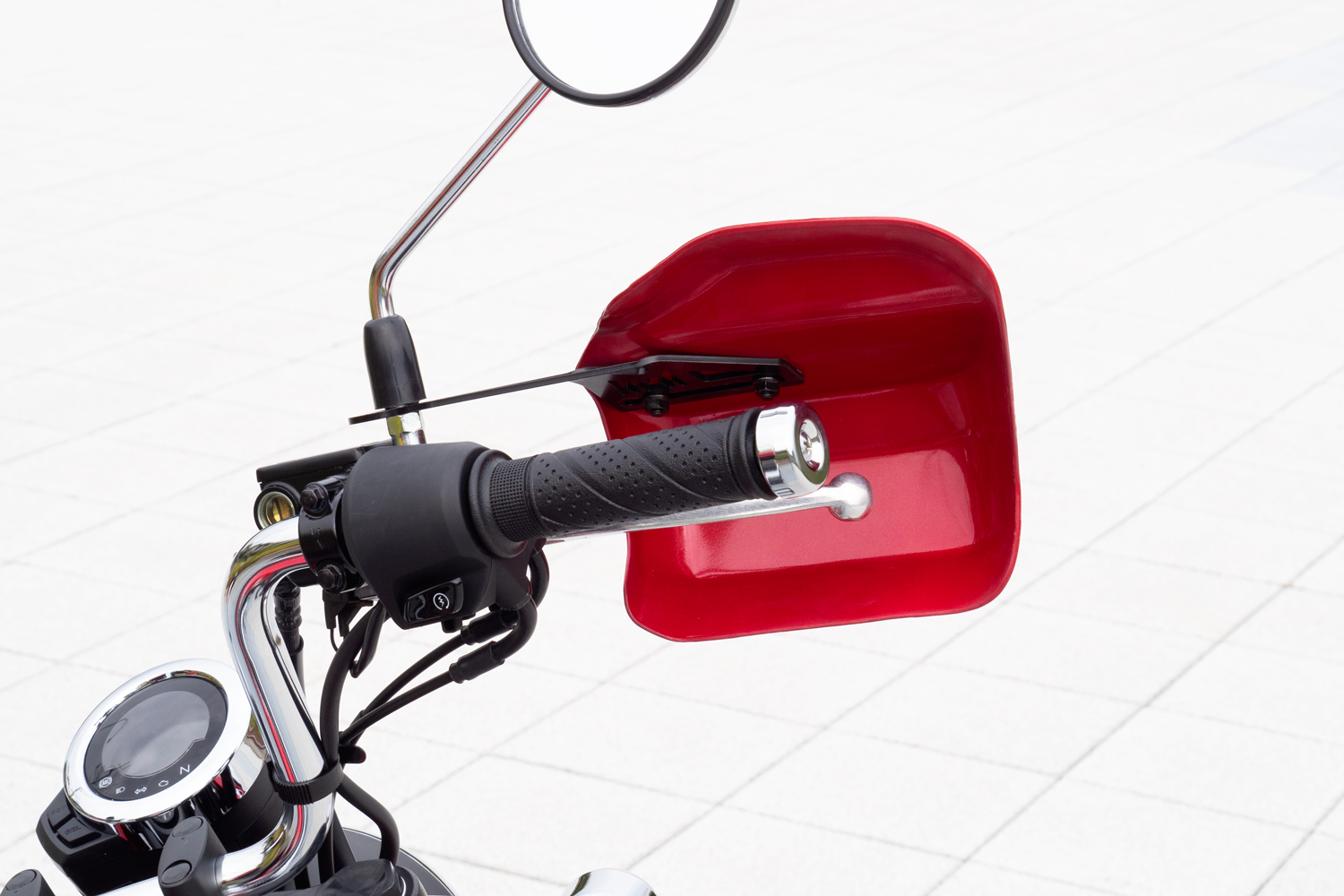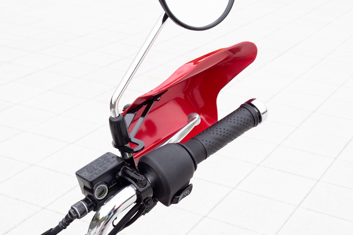 ・カラー:パールネビュラレッド・素材:スクリーン…アクリル ステー…スチール・付属品:ナックルガード本体/取り付けステー左右/取り付けボルトセット一式/取扱説明書・外寸:サイズ画像をご査収ください。防風・防寒・疲労軽減等々…大きな役割を果たしてくれるのがナックルガード。上下に大きなサイズ感は抜群の風防効果を発揮してくれるため、疲労軽減にも繋がります。冬場は防寒の役割をも果たしてくれるので、ロングツーリングをされる方には必須のアイテムです。キャッチ―な見た目の純正色のナックルガードはダックス125の車体イメージを崩す事なく馴染んでくれます。一から開発した専用ステーは軽量化を実現。より使用感も向上しました。こだわりの専用ステー取り付け箇所はナックル本体へのセットとミラー基部だけというシンプルな造り。ミラー基部は長穴仕様になっているので、多少の微調整も可能です。 汎用品程のフレキシブルさはありませんが、ナックル側に取り付けたステーの位置も左右に動かせるので取り付け時の微調整も可能です。ナックルガードの課題「振動」の軽減ハンドルにクランプさせるナックルガードの形状の特性として、 「振動が伝わりやすく、ガタつきを感じやすい」といったデメリットがあります。専用ステーは厚みのある一枚板で作られているため、金属疲労を起こしにくく、丈夫な造りになっております。厚みのあるステーの形状なので、余計な振動も軽減されます。「WW」の型抜きロゴべたっとした一枚の板のステーでは見た目もいまいちな上、重さによる余計な負荷もかかってしまいます。ステーの強度を保ちつつ軽量化を図るため、型抜きのデザインを採用しました。 黒のカチオン塗装仕上げなので、車体との一体感も抜群です。雨にも強いスクリーン形状防水のグローブをつけていても、縫い目やグローブの淵から多少の雨が侵入してしまう事もありますよね。しかし、手が濡れた状態で風があたると表面に付いた水が冷えて手元の温度を下げてしまいます。そこで出来る限り手元が濡れないように、上下に大きさを広げるだけでなく「くの字」形状を採用。雨が手にかからないような設計にしました。 手の甲だけでなく腕から肩にかけての風当たりも大きく軽減する為、疲労を軽減する効果もあります。車両との抜群の一体感「見た目の印象が変わってしまうからナックルガードは付けない」そんな方も居ると思います。純正色塗装を施したナックルガードは車両のイメージを損なわず、あなたのダックス125にマッチしてくれる筈です! キャッチ―な見た目のダックスは車体色と合わせる事でナックルガードだけが悪目立ちしてしまうのを防ぎます。塗装リアボックスとの同時取り付けもおすすめです。一点一点手作業で塗装しますバイクは塗装する面積が狭い為、塗装と乾燥を3度繰り返す3コート塗装や4度繰り返す4コート塗装が採用されており、調色も困難を極めます。経験豊富な職人が作業にあたっても困難で時間がかかる作業ですが、一点一点手作業で仕上げております。その為、お手元に届くまでお日にちを頂いておりますが、愛車とほぼ同じカラーに塗装された一体感にご満足頂ける筈です。※デザイン・仕様は予告なく変更されることがございます。予めご了承ください。※ご自身でお取り付けを行った場合はいかなる場合も保証の対象外となります。ご理解頂きますようお願い申し上げます。※本製品は受注生産となっており、お届けまでにお日にちを頂戴しております。誠に恐れ入りますが予めご了承ください。