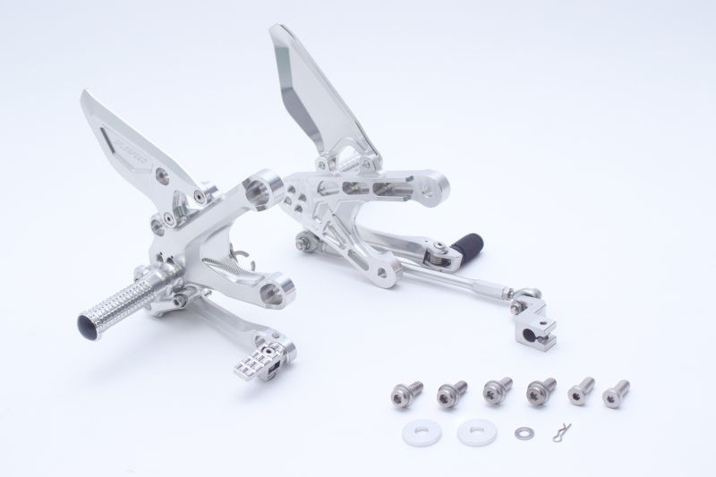 ストレスフリーなペダル操作へ。レースのために考えられた設計は、ストリートでも多くの利点があります。純正ポジションから最小限の位置変更で、サーキットからストリートまで楽しめるパフォーマンスを発揮。ステップワークを妨げる要素を徹底して排除し、操作性を追求しました。メインフレームと一体化したような剛性感、滑らかな操作感、機能美を追求したシンプルな外観をお楽しみください。材質:アルミ7075、(一部)6061フル3D切削加工逆シフトチェンジ対応(一部車種除く)ノーマルブレーキスイッチ移設設計チェンジペダル用エクステンション(10mm/20mm)付属ポジション1:BACK23mm、UP33mmポジション2:BACK23mm、UP45mmポジション3:BACK35mm、UP33mmポジション4:BACK35mm、UP45mm