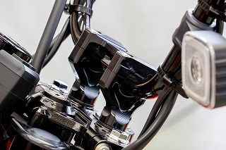 ハンドルを上方&前方へ移動させることで上体の窮屈さを改善。Uターンなどの旋回時でも肘と膝が当たりにくく、安心して操作することが出来ます。クランプを左右対称なデザインとすることで、違和感のない2ポジションを可能としました。2段階調節STD比:10mmアップSTD比:15mmアップ、9mmフォワードブラックアルマイト仕上げSTDトップブリッジ対応STDワイヤー&ホース対応クランプ部22.2mmハンドルバー対応