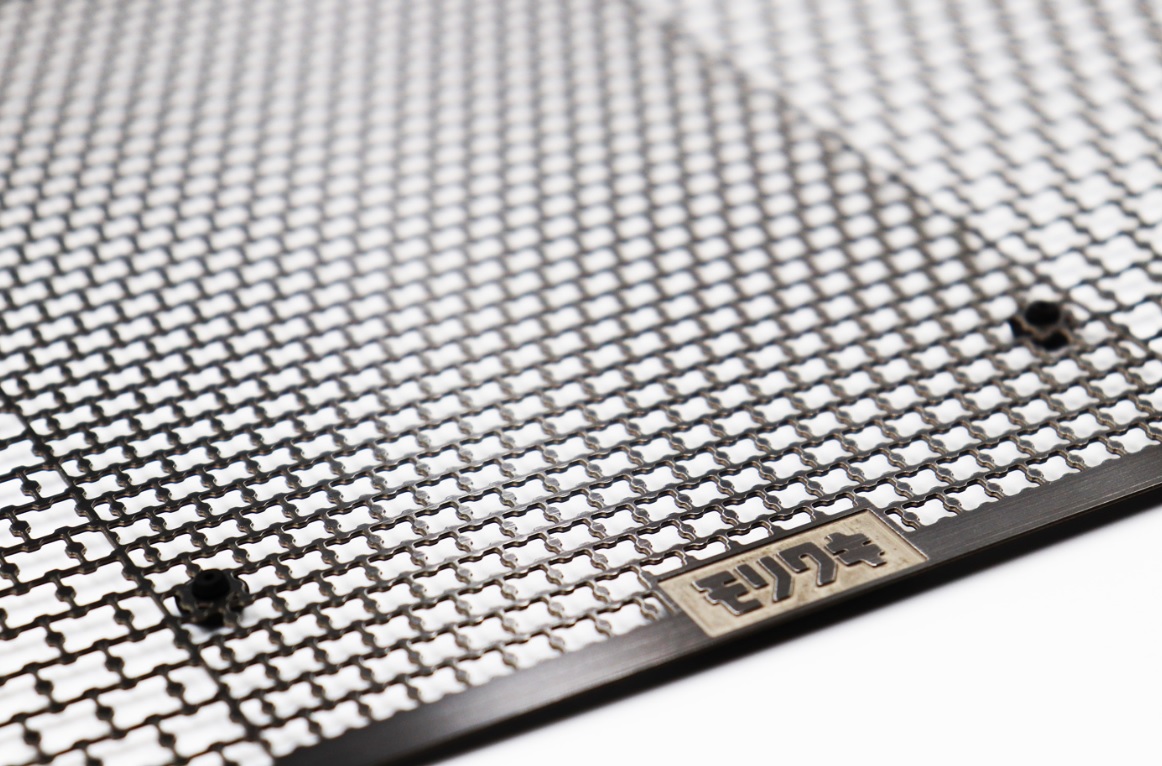 「ラジエターコアガードの役目」エンジンの冷却を行うラジエター、その心臓部分ともいえるコアは非常に薄いフィン形状で構成されています。その為、フロントタイヤから巻き上げる石やタイヤカスによりダメージを受けた場合フィンが曲り冷却効率が著しく低下します。またウォーターラインを破損した場合は走行不可になる場合も想定されます。その様な可能性からコアを保護する目的のパーツがコアガードとなります。「サクラパイプの断面形状で構成されるメッシュデザイン」コア部分のデザインはモリワキの独創性をけん引してきたフレームワークを連想させる、サクラパイプ断面形状とすることで他に類を見ないシンプルかつ上品なデザインとなりました。十分な開口率と強度を両立させたメッシュパターンは飛び石のダメージが高いセンター部分を細かく、冷却効率の高い両サイドを粗めのパターンに仕上げています。落ち着いた光沢と重厚感のある質感を与えるステンレスブラック。ラジエター本来の性能を発揮するため可能な限り開口率を広げたい、そのためには材質本来の強度も必要になります。車両の前面に立ち、過酷な状況にさらされるからこそ必要となる耐久性/耐腐食性。これらの条件をクリアするのが今回選定されたステンレス材(SUS304)となります。