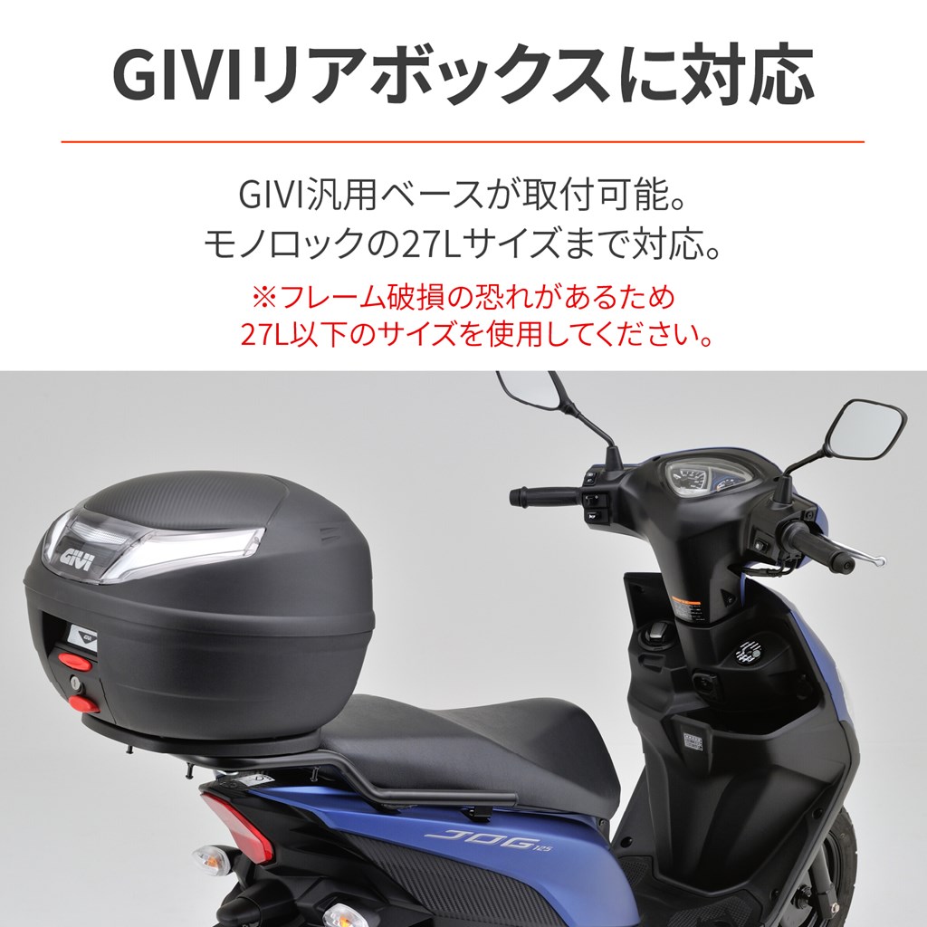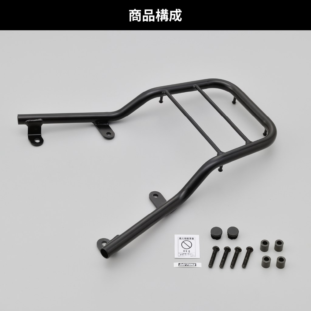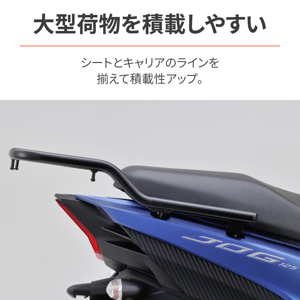 グラブバータイプのすっきりしたデザイン。積載時の安定性と実用性を重視した、グラブバーキャリア。タンデムシートと荷台の上面がフラットなので、大きな荷物も安全に積載できます。タンデム時にはグラブバーとしても使用可能です。GIVI汎用ベースが取付可能(モノロック27L以下に対応)最大積載重量:4kg積載部分寸法:長さ196×幅(前側)232×幅(後側)266 mm※GIVIボックス取り付けの場合は27L以下のサイズを使用してください。フレーム破損の恐れがあります。※最大積載重量を超える重量のトップケースは使用しないでください。