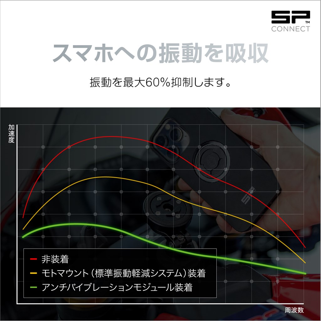 スマホカメラの振動ダメージを軽減。各マウントのフォンケース装着部を交換して取り付けるオプション品。独自開発の振動軽減ラバーが振動を最大60%まで抑制、最新のスマートフォンに搭載されるカメラなど、繊細な電子機器へのダメージを軽減します。360度回転対応で6度刻みで細かい角度調節が可能です。最新のスマートフォン(特にiPhone10以降のモデル)をご使用する場合は、アンチバイブレーションモジュールの装着を推奨します。SPC+フォンケース用オプション品独自開発の振動軽減ラバーが振動を最大60%まで抑制最新スマホに搭載されるカメラなど、繊細な電子機器へのダメージを軽減各マウントのフォンケース装着部を交換して取り付けiPhone10以降は装着を推奨※本品の動きを制限する恐れがあるため、シリコンバンドを外してご使用ください。また、スマートフォンの脱落を防ぐため、フォンケース装着の際は取り付けを目視でもご確認ください。※車両から伝わる振動・衝撃によるダメージをより軽減するためのモジュールです。スマートフォンの全ての故障を回避できるものではありません。※フォンケースに付属する樹脂製の変換アダプターは使用できません。