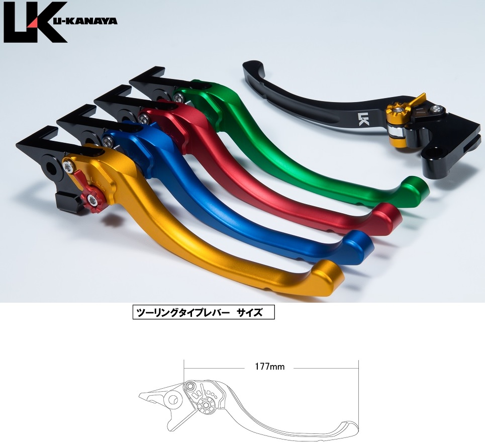 レバー本体カラー:ブルー(ツヤなし:ツヤ無色の落ち着いたカラーリングです。)ツーリングタイプ レバー部全長:約177mm ※アタッチメント部は含まず。素材:6061アルミ材※アジャスターを8色よりお選びください。U-KANAYAの製品は元GPライダーの金谷秀夫氏と内商会のコラボレーションによる商品です。内商会の管理の下で精密加工しております。U-KANAYAの全商品は、日本国内にて専門のスタッフが製品の組み立て及び検品を行っておりますので、安心してご使用いただけます。【ツーリングタイプレバーの特徴】従来の削り出しレバーと違い、握り部分が緩やかな曲面形状となるため、手に馴染みやすくレバーを握りこんだ際に力が逃げにくい形状になっており握る力のロスが少ないため手や指の疲れが気になるロングツーリングなど距離を走るシーンにも最適です。レバーデザインは加工部分を減らして奇抜なデザインにならないように多くのユーザーに受け入れるよう落ち着いた雰囲気を演出しています。レバーエンド形状の最適化によりバーエンドへの接触を極力おさえる構造【商品説明】高強度で耐食性に優れた6061のアルミ材をマシニング加工後、硬質アルマイト処理を施して高級感のある仕上がりになっています。精密なフルマシニング加工により高級感のある仕上がりとなっています。純正のレバーと入れ替えるだけで簡単に装着可能です。車種によっては純正の部品を流用します。純正レバーと比べてレバー位置が手前にくるため力を掛けやすい形状になります。手の小さい方や純正レバーを遠くに感じていた方に特にお勧めです。カチッとしたクリック感の良いワンタッチアジャスターによりレバー位置を近くから遠くまで6段階で調整可能。レバー先端部分で約30mmの調整幅があります。レバーの長さは約177mmです。 ※アタッチメント部は含まず。内商会独自の管理システムを導入していますので、万が一のアクシデントによる破損部品の部品供給にも迅速に対応可能です。補修部品も細かく設定されているので、破損部品の供給もスムーズです。商品は予告なしに価格や仕様を変更する場合がありますのでご了承ください。純正のクラッチレバーホルダーカバーが付いている車輌の場合、一部加工または取り外しが必要な場合があります。モニターの環境により、画像の色が実物と若干異なって見える場合がございます。画像はイメージです。取付アタッチメントの形状が実物とは異なる場合があります。