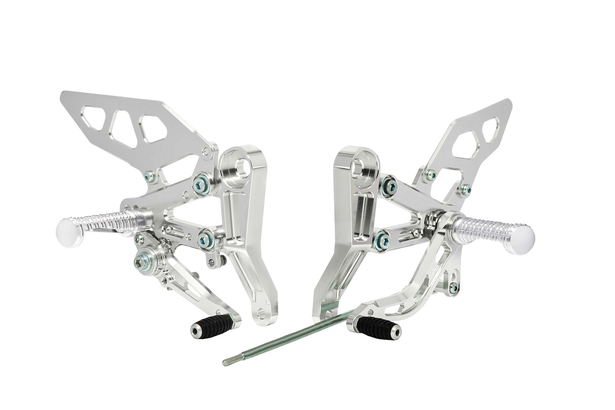 適合マフラー:スタンダード、モリワキ製マフラーポジションA:23mm アップ、33mm バックB:23mm アップ、43mm バックC:33mm アップ、33mm バックD:33mm アップ、43mm バックその他正チェンジ仕様タンデムステップ使用可能サイドスタンド取付け可能市街地もサーキットも性能を最大限に生かす、4 ポジションバックステップ。総削り出しのジュラルミンがライダーフィーリングを更に向上。「乗る」から「操る」への変化をコンセプトに開発されるモリワキ製バックステップは前後左右ライダーの操作にリニアに反応、純正の可倒式ステップバーでは得られない攻めのステップがライダーをサポートします。