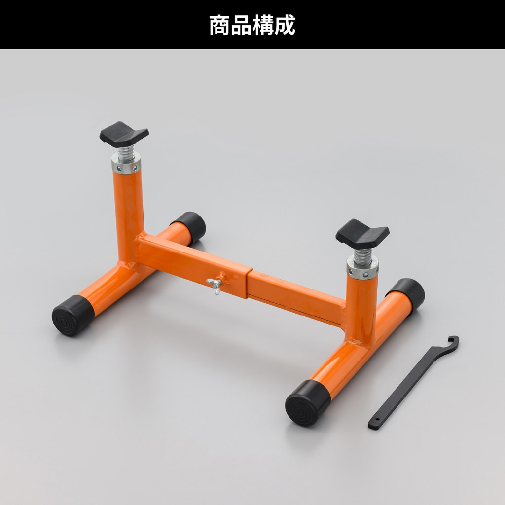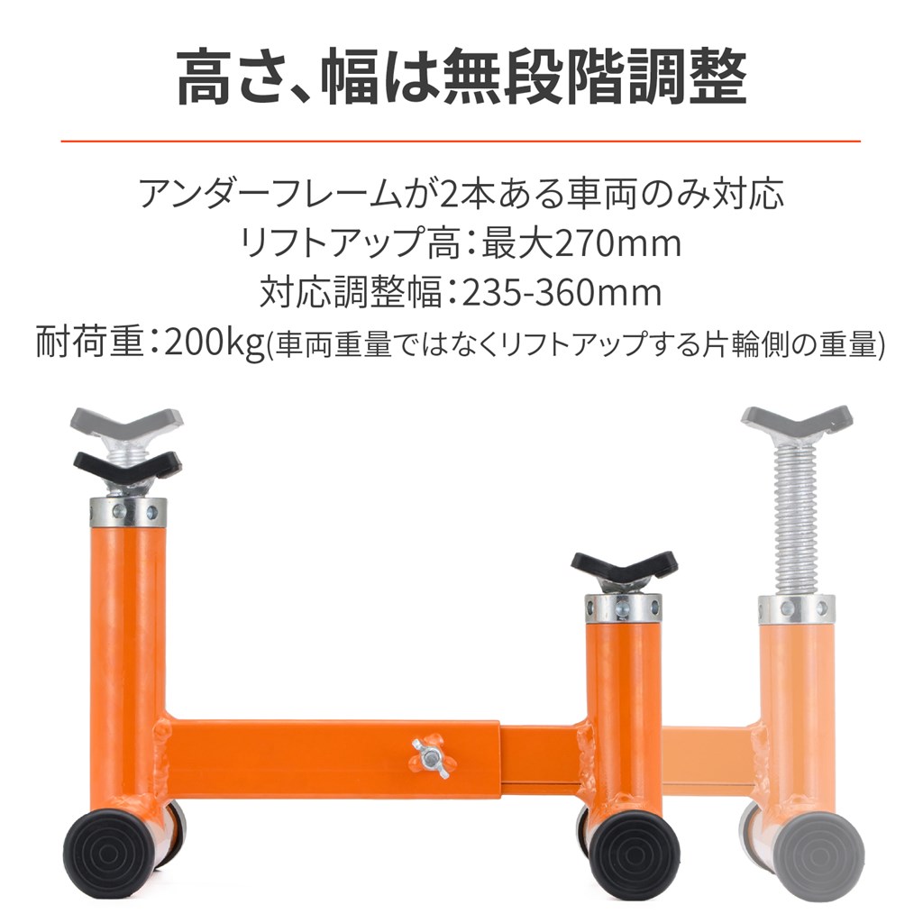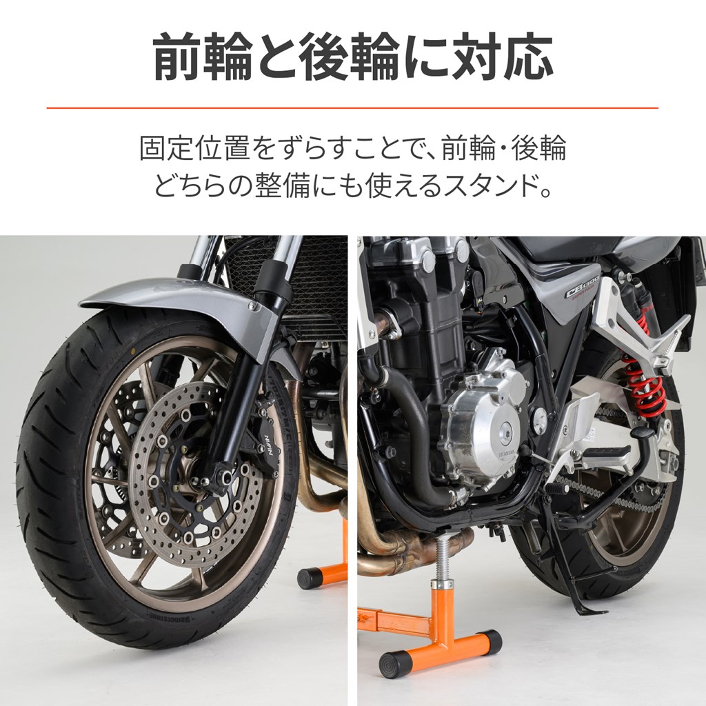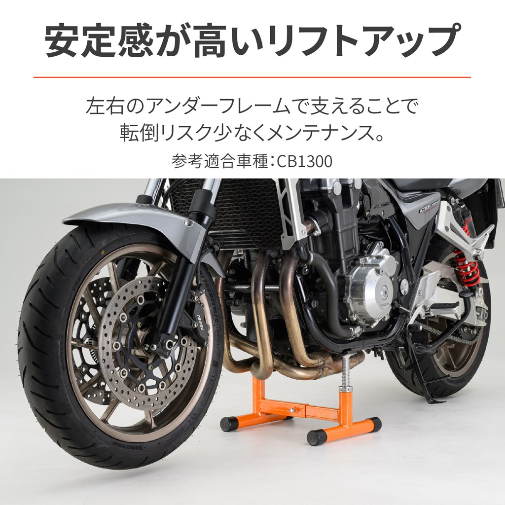 ビッグネイキッド等のアンダーチューブ(フレーム)が通っている車両を直立にリフトアップするための商品です。左右高さ違いの設計でサイドスタンドをかけた状態から1人で安全に安定したリフトアップが可能。前輪のリフトアップと後輪のリフトアップにも対応し、通常のスタンドと違い、ステムやスイングアーム等に掛けないため作業幅も向上します。強風などの転倒対策にもオススメ。使わないときはコンパクトに収納可能。【参考適合車種】CB1300SFアンダーチューブ(フレーム)で支えるバイク用メンテナンススタンドサイドスタンドをかけた状態から1人で安定したリフトアップが可能前輪のリフトアップと後輪のリフトアップに対応強風などの転倒対策にもオススメ高さ調整:最大270mm / 幅調整:235-360mm / 耐荷重:200kg(リアまたはフロントのリフトアップ重量)※アンダーチューブ(フレーム)がない、または1本しかない車両にはご使用できません。※アンダーチューブ(フレーム)以外でのジャッキアップはできません。