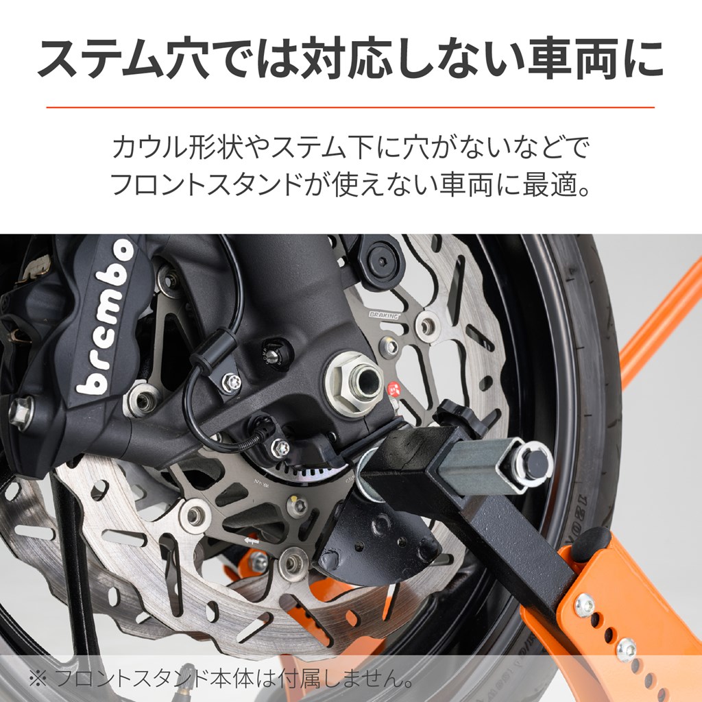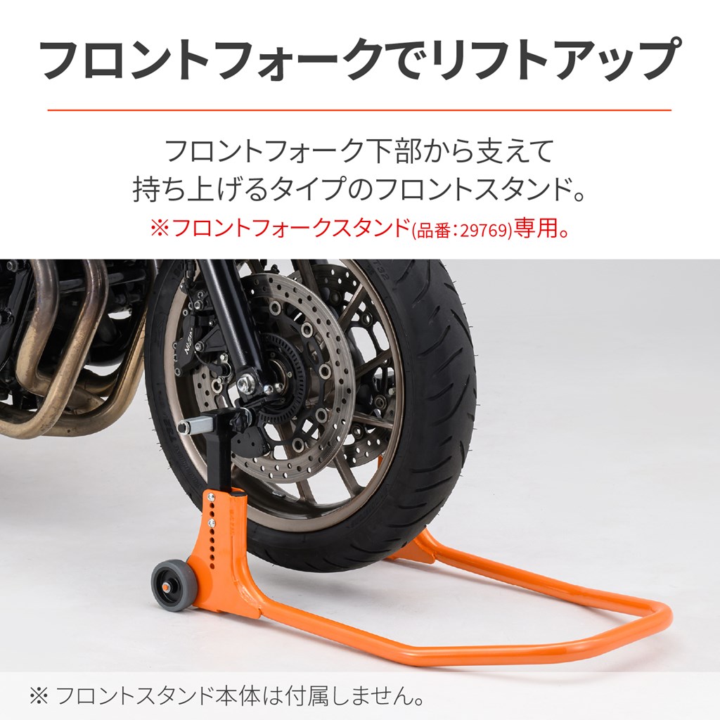 フロントフォークスタンド(品番:29769)専用の補修品。フロントフォーク下部から支えて持ち上げるタイプのアタッチメント。カウルに干渉したりステム下に穴がないなど、フロントスタンドが使えない車両に最適です。リフトアップ面はカウンターウエイト(重り)によって常に上を向く構造なので簡単にリフトアップが可能。フロントフォークスタンド(品番:29769)専用のアタッチメントリフトアップ面はカウンターウエイト(重り)によって常に上を向く構造※フロントフォークスタンド(品番:29769)以外のスタンドに使用すると、最小幅とローラー設置の関係で、車両が脱落する恐れがあります。
