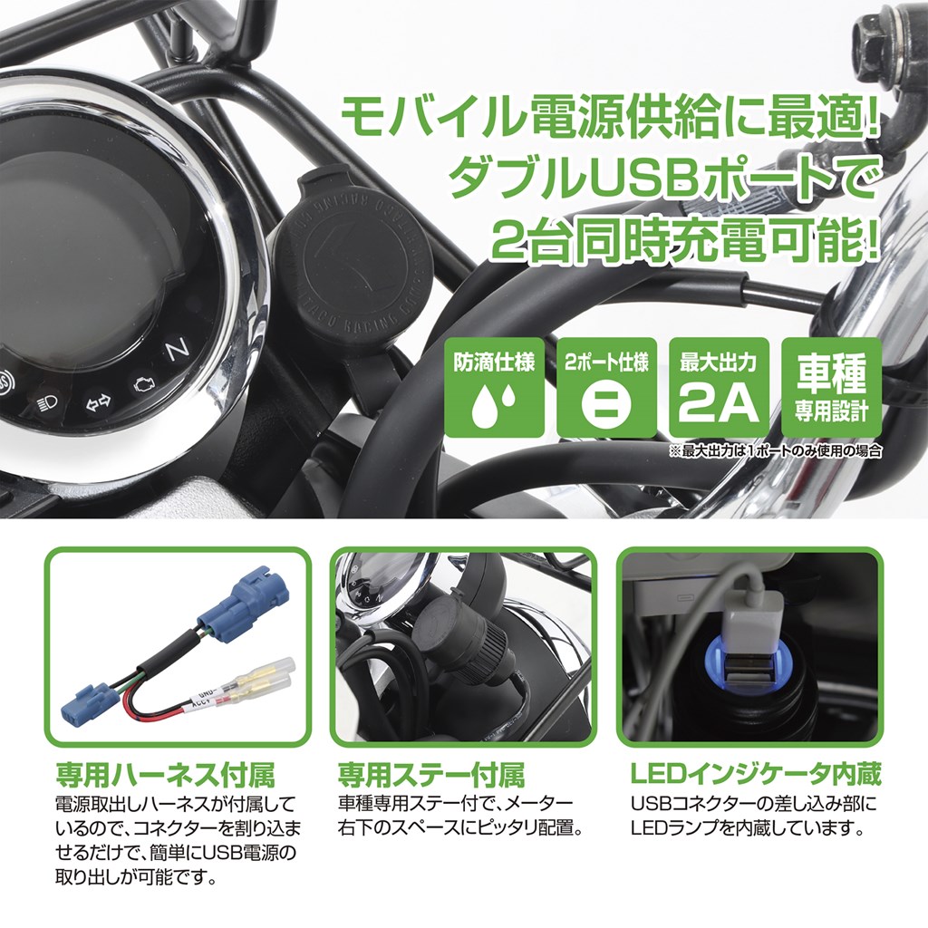 モバイル電源供給に最適な2ポートタイプのUSB電源に専用ハーネスを付属した車種専用タイプです。※完全防水ではありません。洗車・雨天時は使用しないで下さい。また使用しないときは付属のゴムキャップを必ず装着してください。※温度変化等により本体(ゴムキャップ)内部に結露が発生する恐れがあります。温度変化の激しい場所(エンジン周り)は避け、こまめに確認し水滴は除去してください。(エアダスター、掃除機等で水滴を除去して下さい。)トラブルの原因になる可能性があります。USBポート:1,000mA×2個DC12V/DC5V 最大出力:2,000mA(1ポートのみ使用の場合)防滴仕様LED内蔵(ブルー)電源取り出し箇所:ヘッドライトケース内オプションカプラ―