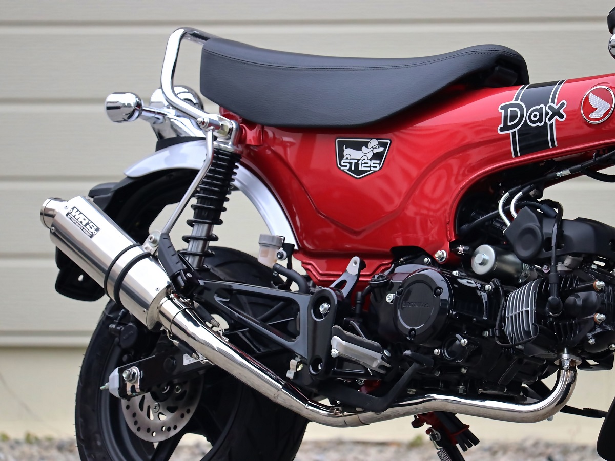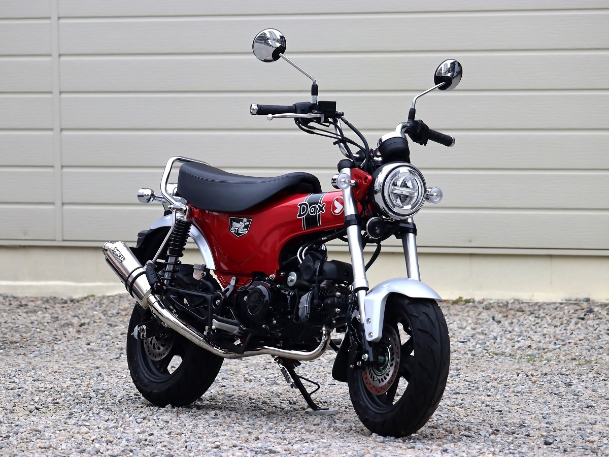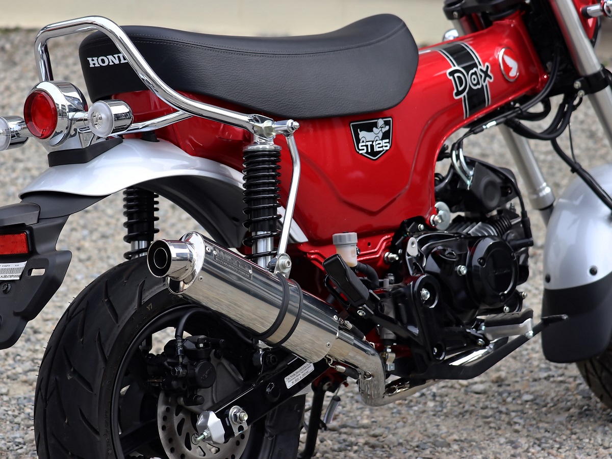 ダックス125に敢えて採用したダウンタイプマフラーはレイアウトに拘りスポーティーな雰囲気を演出してくれます。走行テストで得たデータから管長を探り、最終的にベンチテストで仕上げており、ピックアップの良さやアクセルの連動性、パワーフィールの向上を目指して開発しました。スリムな車体に合わせてショートオーバルサイレンサーを採用。スリムでコンパクトなサイレンサーは車体の重量バランスにも貢献。材質により純正比47〜52%の軽量化も達成しており、操安性にも貢献しています。音質は低音域を効かせつつも音量をしっかり抑え込み、通勤通学・タウンユースやツーリングでも疲れにくい音量・音質に仕上げています。【マフラー重量】※※ボルト類含む総重量:ステンレスサイレンサー仕様:2.87kg(ノーマルマフラーは5.40kg)近接/加速騒音値:83・84dBOF/Dボルト:OKJMCA認証