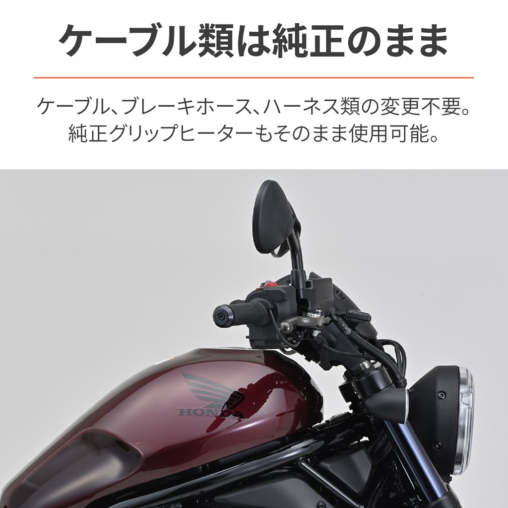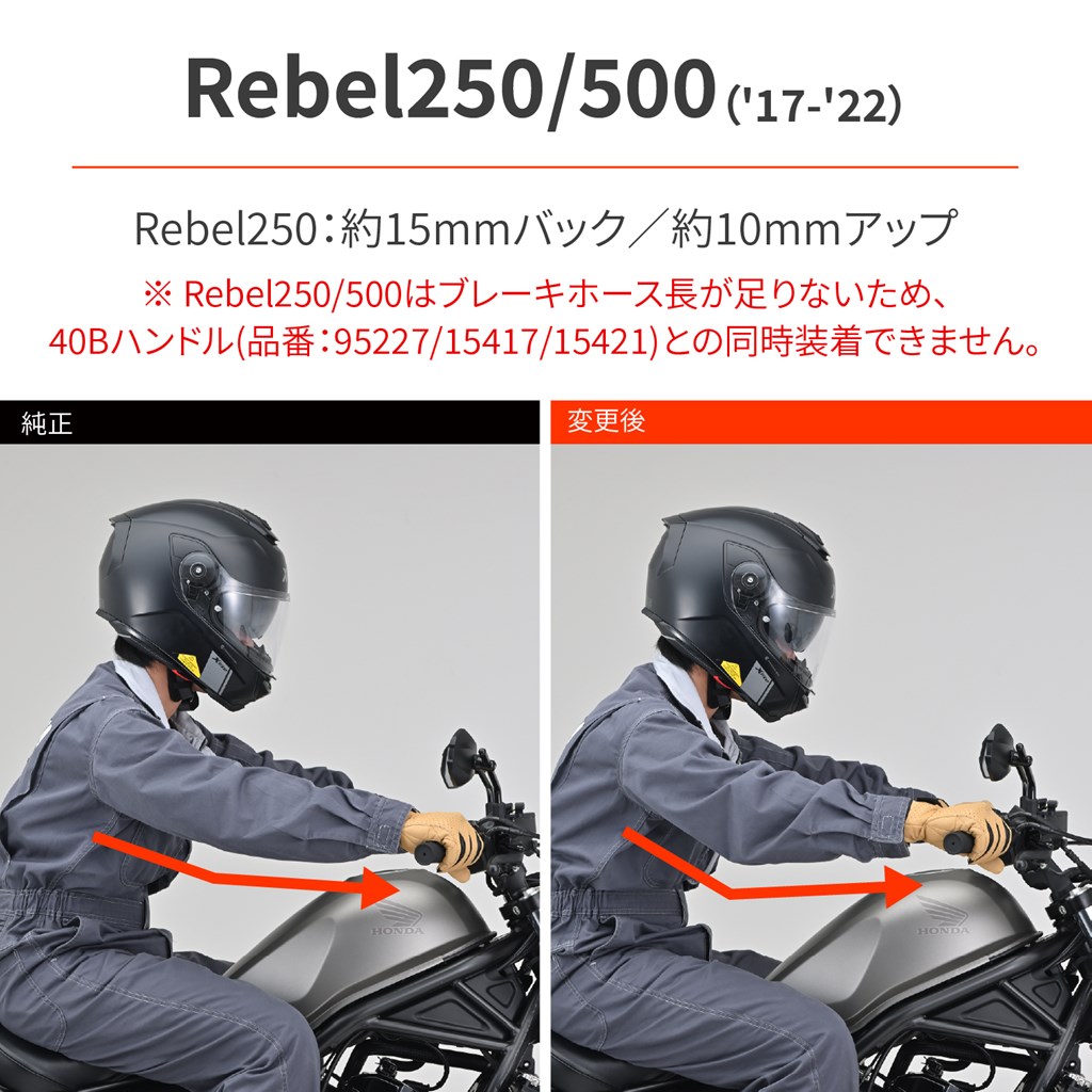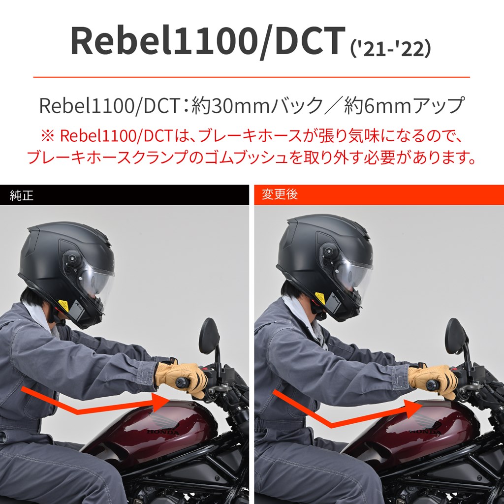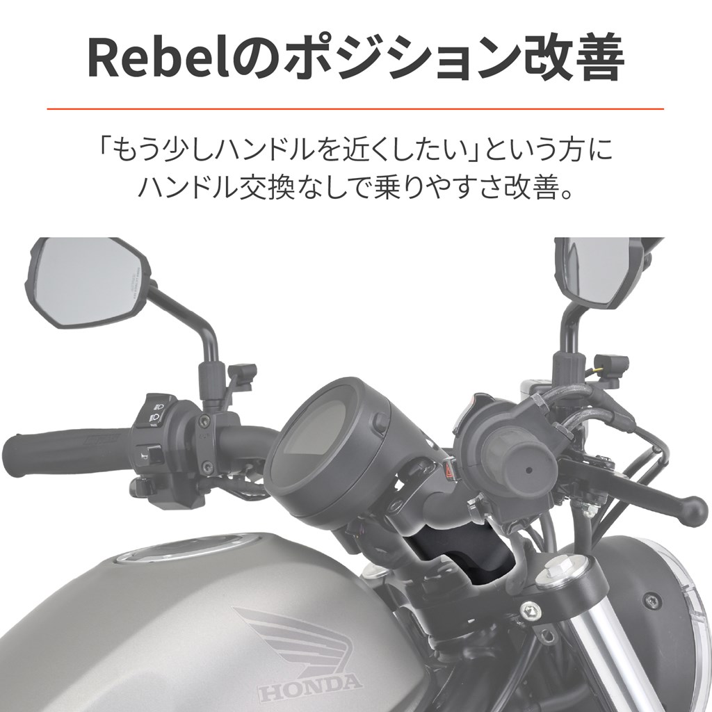 ハンドルを手前にしてポジションを改善。「もう少しハンドルを近くしたいな〜」という方に、純正ハンドルを手前に引くことでポジションを乗りやすく改善します。ケーブル、ブレーキホース、ハーネス類の変更も不要で、Rebel1100は純正グリップヒーターもそのまま使用可能。車両の全幅も変わらないので、車検証記載事項の変更も不要です。レブルのハンドルを近くに変更することで、ポジションを改善ハンドル交換、ケーブル類変更は不要の簡単取付Rebel1100/DCT:約30mmバック / 約6mmアップRebel250:約15mmバック / 約10mmアップ※アッパークランプは純正を使用します。※Rebel1100/DCTは、ブレーキホースが張り気味になるので、ブレーキホースクランプのゴムブッシュを取り外す必要があります。※Rebel250/500は、ブレーキホース長が足りないため、40Bハンドルとの同時装着はできません。※純正ハンドル以外は、ブレーキホースやケーブルの長さが足りず取り付けできない場合があります。※メーターの傾きが約10°大きくなります。※製造工程上、ボルト部分には小傷などがみられる場合があります。あらかじめご了承ください。