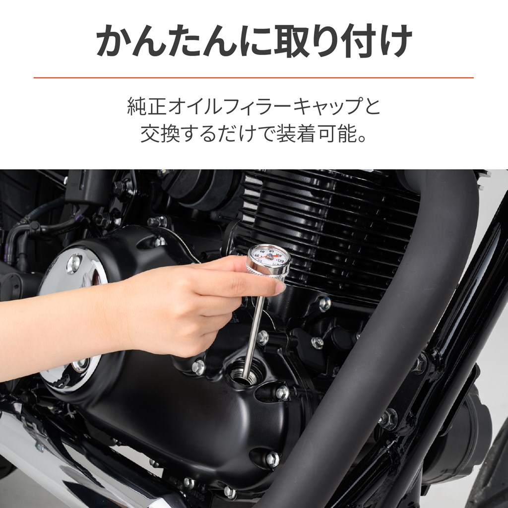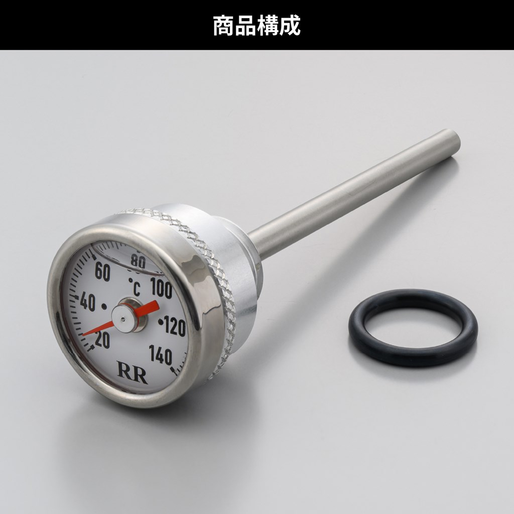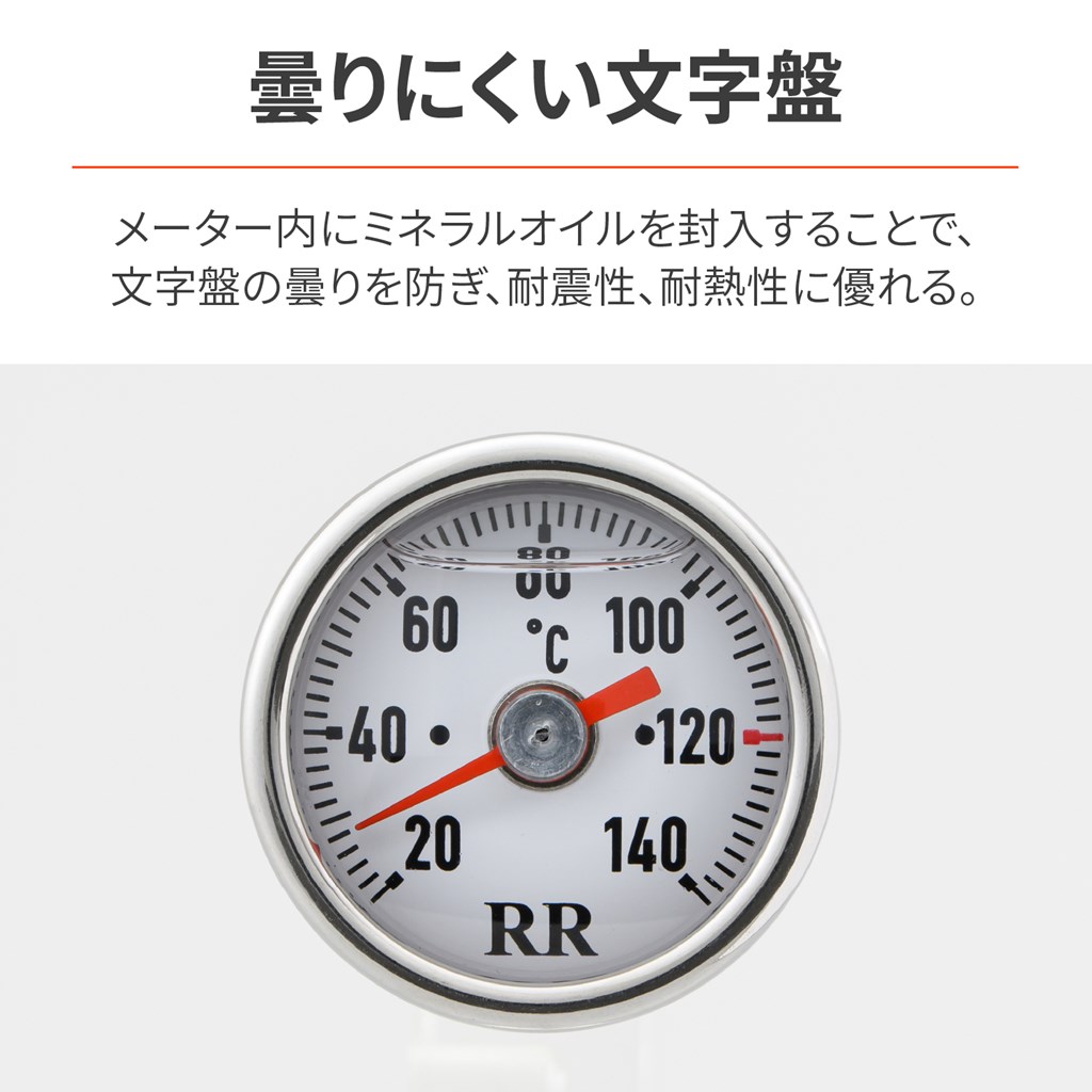 純正オイルフィラーキャップと交換して装着する、ディップスティックタイプの油温計。メーター内に封入したミネラルオイルは、文字盤の曇りを防ぐとともに、耐震性、耐熱性を発揮します。油温表示0〜140℃。本体部:アルミ削り出しアルマイト仕上げ。レベルゲージパッキン(Oリング)付属。RR社製。ミネラルオイルで、文字盤の曇りを防ぎ、耐震性、耐熱性を発揮純正オイルフィラーキャップと交換して装着レベルゲージパッキン(Oリング)付属油温表示:0-140℃※KEDO社品質基準の商品ですので、小傷などがある場合がありますが、あらかじめご了承ください。※メーター内に気泡がありますが異常ではありません。