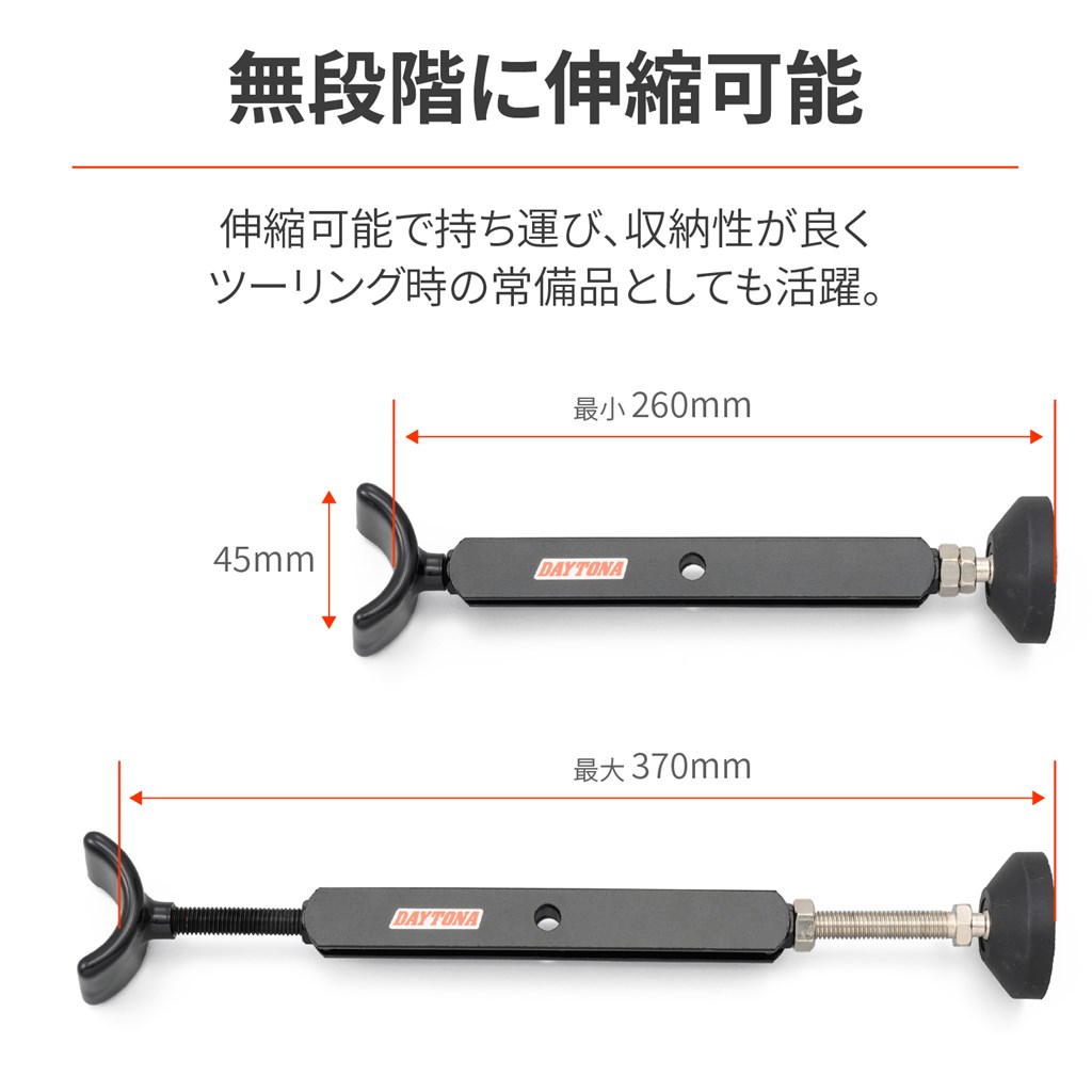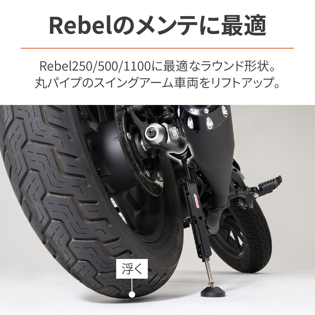 サイドスタンドと併用してリアホイールを持ちあげるための簡易スタンド。接触部分をラウンド形状にすることで、丸パイプのスイングアームに対応。特にレブル250/500/1100に最適なラウンド形状で設計。ホイール清掃やチェーン注油などの簡単なメンテナンスや、強風や地震などによるバイクの転倒防止対策としても役立ちます。無段階で高さ調節が可能なため、さまざまなバイクに対応します。【参考適合車種】Rebel1100 / Rebel500 / Rebel250リアホイール清掃、チェーン注油時の簡易スタンド丸パイプのスイングアームに対応。レブル250/500/1100に最適なラウンド形状有効調整範囲:260〜370mmの範囲で無段階調整接地部分の可動域が広いため車種を選ばず高い安定性強風や地震などのバイク転倒対策にも※必ずブレーキロックを使用してください。荷重がかかるとアジャスト部分が回転します。デイトナ製「フロントブレーキロック(品番:91712)」の同時使用を推奨します。※チェーンメンテナンスやホイール清掃をするための商品です。ホイールを取り外すようなメンテナンスには使用できません。※塗床などの上で使用する場合は、接地部が滑りやすいのでご注意ください。
