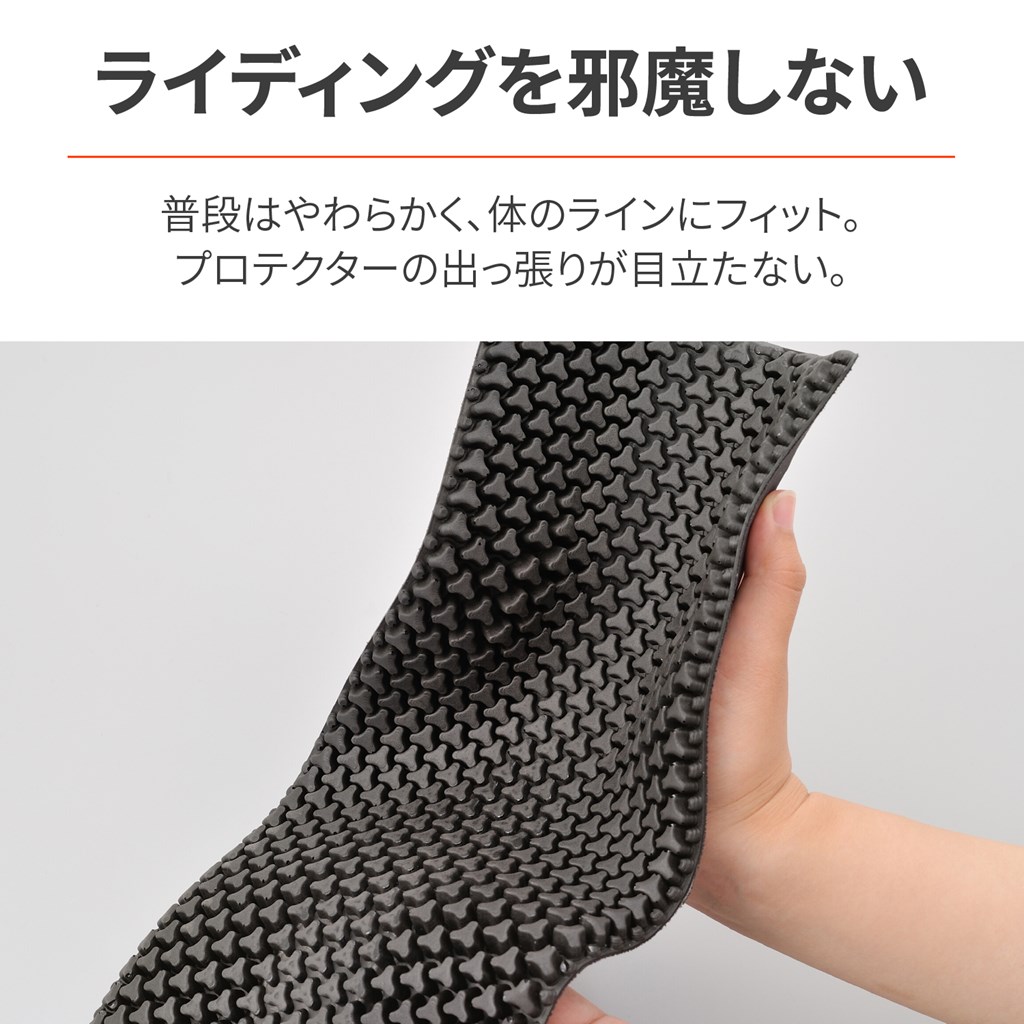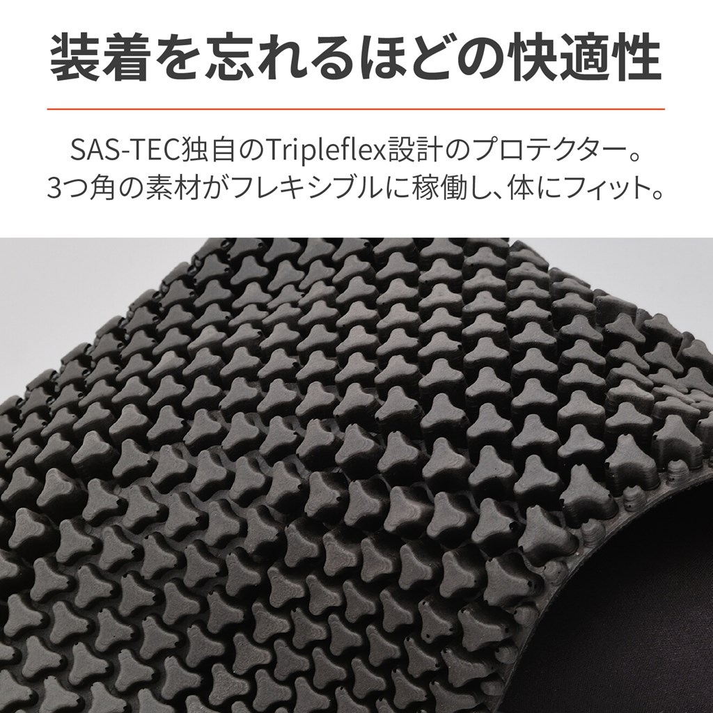 可動部をしなやかに包み込み、ピンポイントでカラダを守る。【つけていることを忘れるほど快適】3つ角の衝撃吸収素材がフレキシブルに稼働することで、可動部をしなやかに包み込み、あらゆる体のラインにフィット。ウエアの上からも目立ちません。【いざという時は瞬間硬化して衝撃を吸収】本体の素材は衝撃が加わったときに瞬間硬化する特殊な発泡ウレタンを使用。繰り返しの衝撃にも吸収性を失わずライダーの体を守ります。全てCE規格を取得。【軽量でライダーへの負担が少ない】素材そのものが軽量で植物性ウレタンベースのため、ライダーにも自然にも優しいプロテクターです。【水洗いOKで、清潔に使用できます】素材の水分吸収率が1%以下と低く、手洗いが可能です。(洗濯機では洗わないでください)バイク用 背中プロテクター CE規格レベル1クリアSAS-TEC独自のトリプルフレックスで、3つ角の衝撃吸収素材がフレキシブルに稼働プロテクターが目立たず、あらゆる体のラインにフィット衝撃が加わったときに瞬間硬化する特殊な発泡ウレタン。弱い衝撃時はソフトに吸収、強い衝撃時には硬く吸収サイズ:縦392×横150×厚み9 mm / 重量:約205g※吸水性が低く、水に強い素材ですがウエアへの色移りやウエアへのダメージが発生する恐れがございますので、ウエア装着時は外してから洗濯をしてください。※プロテクターは単体で水で手洗いし、形を整えて陰干ししてください。※CE規格を取得しておりますが、完全に体を保護するものではありません。