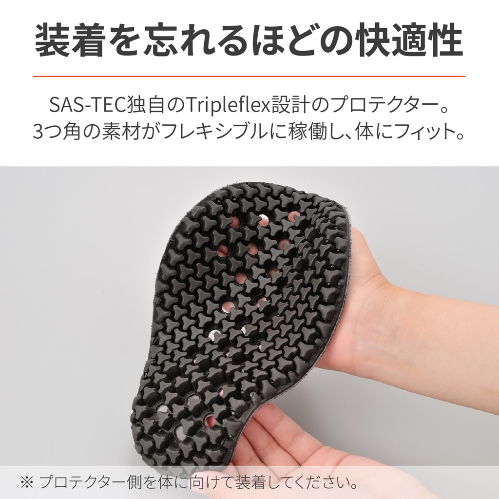 可動部をしなやかに包み込み、ピンポイントでカラダを守る。【つけていることを忘れるほど快適】3つ角の衝撃吸収素材がフレキシブルに稼働することで、可動部をしなやかに包み込み、あらゆる体のラインにフィット。ウエアの上からも目立ちません。【いざという時は瞬間硬化して衝撃を吸収】本体の素材は衝撃が加わったときに瞬間硬化する特殊な発泡ウレタンを使用。繰り返しの衝撃にも吸収性を失わずライダーの体を守ります。全てCE規格を取得。【軽量でライダーへの負担が少ない】素材そのものが軽量で植物性ウレタンベースのため、ライダーにも自然にも優しいプロテクターです。【水洗いOKで、清潔に使用できます】素材の水分吸収率が1%以下と低く、手洗いが可能です。(洗濯機では洗わないでください)バイク用 肩、ひじ、ひざプロテクター CE規格レベル2クリアSAS-TEC独自のトリプルフレックスで、3つ角の衝撃吸収素材がフレキシブルに稼働プロテクターが目立たず、あらゆる体のラインにフィット衝撃が加わったときに瞬間硬化する特殊な発泡ウレタン。弱い衝撃時はソフトに吸収、強い衝撃時には硬く吸収サイズ:縦205×横135×厚み10 mm / 重量:約55g(片側)※吸水性が低く、水に強い素材ですがウエアへの色移りやウエアへのダメージが発生する恐れがございますので、ウエア装着時は外してから洗濯をしてください。※プロテクターは単体で水で手洗いし、形を整えて陰干ししてください。※CE規格を取得しておりますが、完全に体を保護するものではありません。