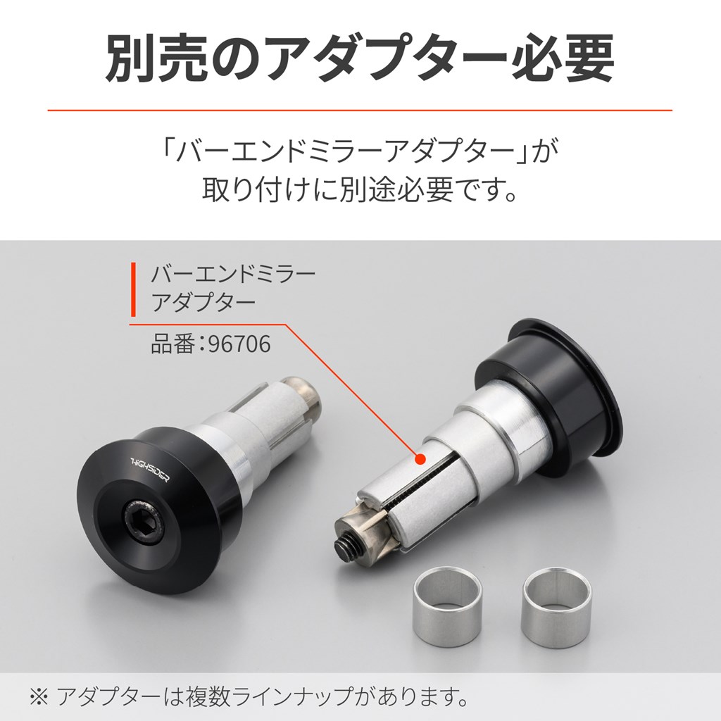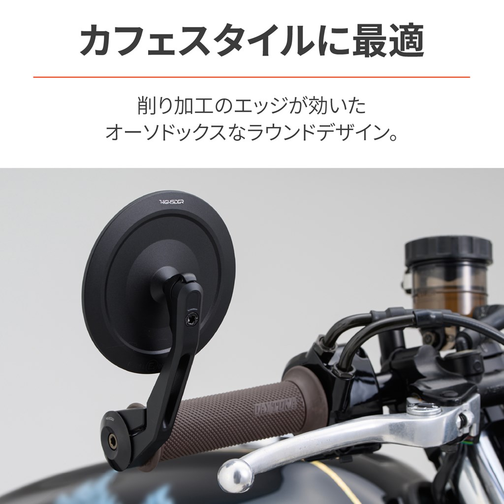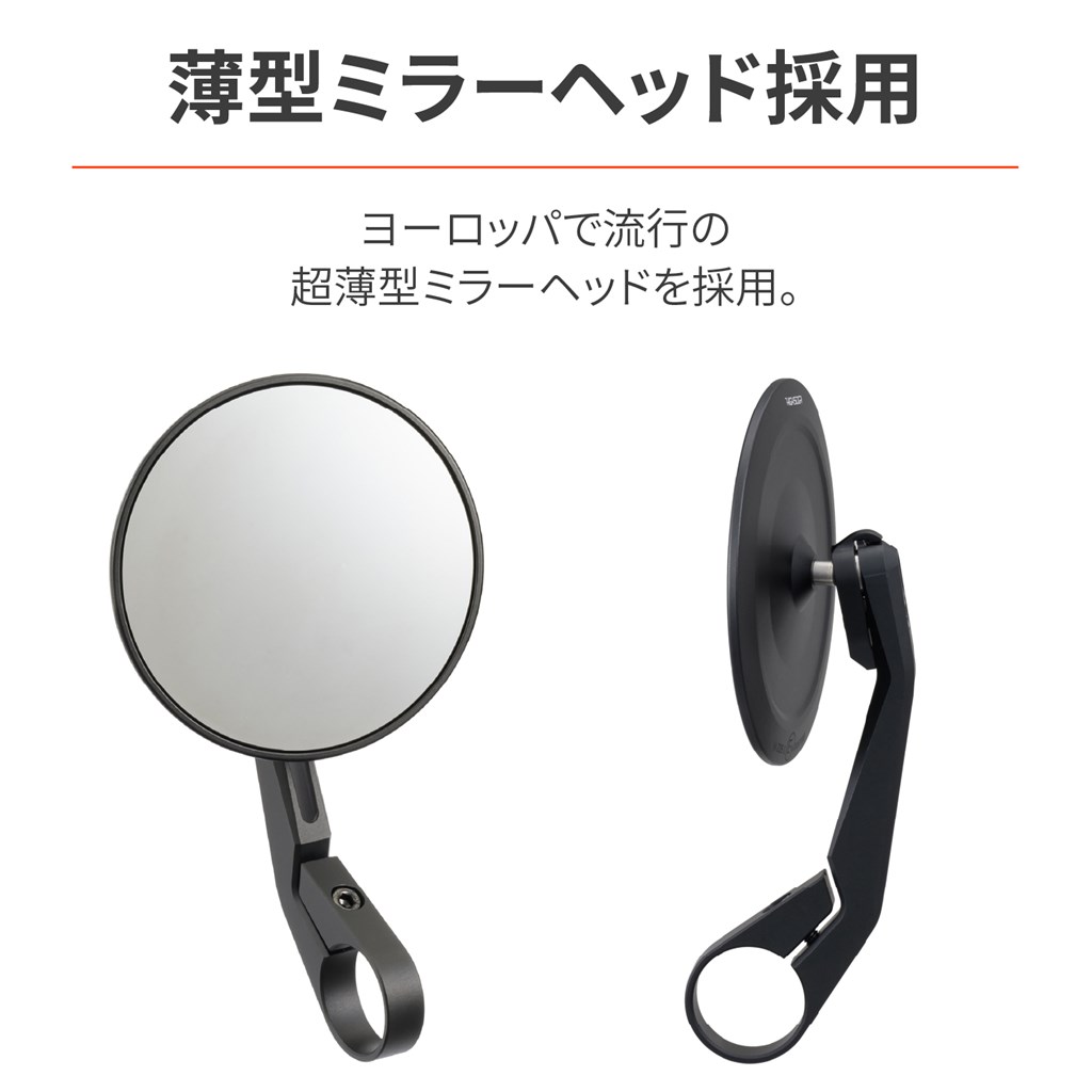 ドイツ生まれのアルミ削り出しミラー。洗練されたデザインのミラーヘッド、エッジの効いたミラーアームで上質なハンドル周りを演出。ヨーロッパで流行の厚さ5mmの超薄型ミラーヘッド。削り加工のエッジが効いたオーソドックスなラウンドデザインはカフェスタイルに最適。ドイツ生まれのバイク用アルミ削り出しバーエンドミラー洗練されたデザインのミラーヘッド、エッジの効いたミラーアームで上質なハンドル周りを演出鏡面:クリアーミラー / ECE規格認証打刻入り / ブラック仕様 / 左右共通片側1本入り新保安基準適合品取付には別売のバーエンドミラーアダプターが必要です※ハンドルを左右に切り車両やレバーに接触しないことを確認のうえ、ご使用ください。※別売のバーエンドミラーアダプターが必要です。