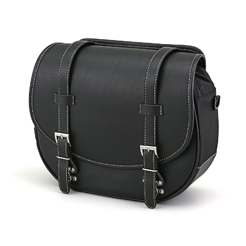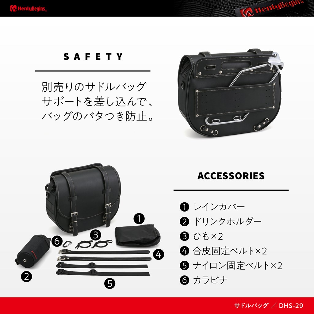 シンプルで丸みを帯びたデザイン。容量:10Lバッグ本体の素材/材質:合成皮革×1680Dポリエステルサイズ:縦270×横360×厚み120mm / 差込部有効幅:260mm【バッグサポート差し込み構造】背面部はサドルバッグサポートに差し込むだけで走行時の振れを抑制。背面下部にも固定用のDカン&ひもが付属。差込み部のプレートには穴が設けられている為、付属ベルトでしっかりと固定が可能。汎用性が高く、幅広い車種に装着が可能。【2種類の固定ベルトが付属】合皮固定ベルトは強度と美しさを両立。ナイロンベルトは薄くて、純正シートレールとフェンダーの隙間に通しやすい設計。【赤い裏地の採用】ライダースをイメージした赤い裏地により、中の荷物が見つけやすい。書類や小物の収納に便利なファスナーポケットを装備。【ワンタッチ金具で簡単開閉】スタイル重視のワンタッチ金具の採用。【盗難対策にリング付きファスナー】ファスナーはリング付きで、盗難抑止に別売りのダイヤルロックが使用可能。【ボトルホルダー標準装備】内側に保冷保温素材を採用。カラビナによりバッグから外して持ち歩きに便利。【ベルト固定部に角カンの採用】力の掛かるベルト固定部には角カンと呼ばれる樹脂パーツを採用して強度をアップ。【生地選び】本革の風合いに近くメンテナンスのしやすい合成皮革と強度の高いポリエステル生地を採用。バイク用サドルバッグ材質:合皮×1680Dポリエステル容量:10L、最大積載重量:5kgサイズ:縦270×横360×幅120mm / 差込部有効幅:260mm商品構成:レインカバー、ドリンクホルダー、合皮固定ベルト×2、ナイロン固定ベルト×2、緩み止めアジャスター×2、ひも×2※バッグの装着には巻き込み防止バーとの同時装着が必要。