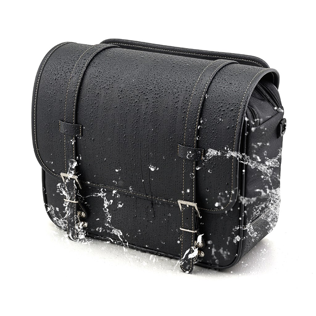 インナー防水構造の採用で高い防水性と晴天時の使いやすさを両立。容量:18Lバッグ本体の素材/材質:合成皮革×1680Dポリエステルサイズ:縦300×横400×幅150mm特長:インナー防水構造【インナー防水】インナー防水の採用で、見た目を損なわず高い防水効果を発揮。突然の雨でも簡単に防水になり、晴天時でも普通のアメリカンバッグと同じようにストレスなく物の出し入れが可能。【脱着可能なインナーバッグ】ライダースをイメージした赤い裏地により、中の荷物が見つけやすい。脱着可能なインナーバッグで、晴れた日は外して使用可能。【バッグサポート差し込み構造】背面部はサドルバッグサポートに差し込むだけで走行時の振れを抑制。背面下部にも固定用のDカン&ひもが付属。差込み部のプレートには穴が設けられている為、付属ベルトでしっかりと固定が可能。汎用性が高く、幅広い車種に装着が可能。【2種類の固定ベルトが付属】合皮固定ベルトは強度と美しさを両立。ナイロンベルトは薄くて、純正シートレールとフェンダーの隙間に通しやすい設計。【ワンタッチ金具で簡単開閉】スタイル重視のワンタッチ金具の採用。【盗難対策にリング付きファスナー】ファスナーはリング付きで、盗難抑止に別売りのダイヤルロックが使用可能。【ボトルホルダー標準装備】内側に保冷保温素材を採用。カラビナによりバッグから外して持ち歩きに便利。【ベルト固定部に角カンの採用】力の掛かるベルト固定部には角カンと呼ばれる樹脂パーツを採用して強度をアップ。【生地選び】本革の風合いに近くメンテナンスのしやすい合成皮革と強度の高いポリエステル生地を採用。バイク用 防水サドルバッグ材質:合皮×1680Dポリエステル容量:18L、最大積載重量:5kgサイズ:縦300×横400×幅150mm商品構成:ドリンクホルダー、合皮固定ベルト×2、ナイロン固定ベルト×2、緩み止めアジャスター×2、ひも×2、カラビナ×1※バッグの装着には巻き込み防止バーとの同時装着が必要。※レインカバーは付属しません。