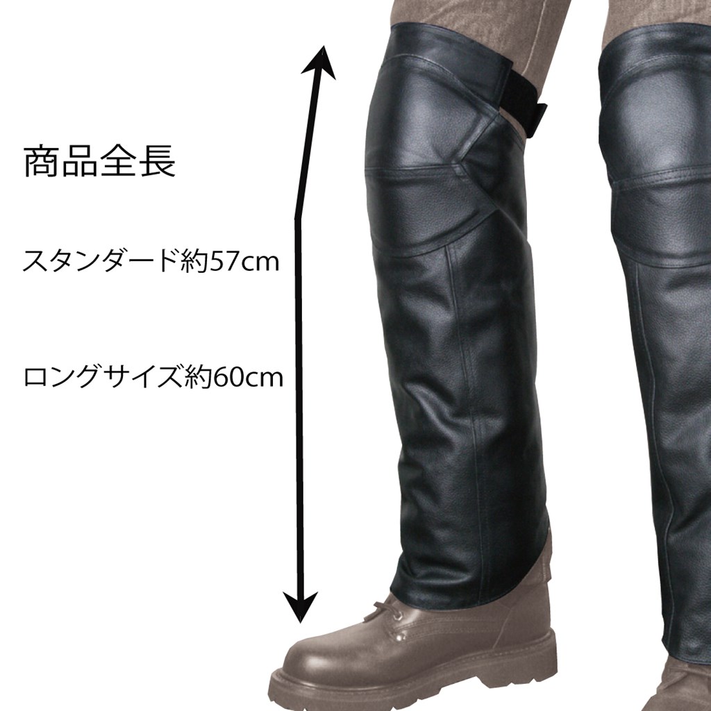 無防備なヒザから下をあらゆる脅威からプロテクト。プロテクション性に優れる牛皮革を使い、衝撃、熱、風などの脅威から足をしっかりガードします。ゴムラバーベルクロアジャストタイプでずり落ちが無くジャストフィットし、装着簡単。パンツ裾に備えられたずり上がり防止ループがずり上がりを防止し、寒風の侵入を防ぐフラップを装備。ヒザ部分にはウレタンパッドを内蔵し、リフレクターパイピングで夜間の走行も安心です。※マフラー、エンジン等熱したものに密着した場合、溶ける、縮む、燃える場合があります。MATERIAL:表地/牛革 裏地/タフタ収納袋付き左右セット