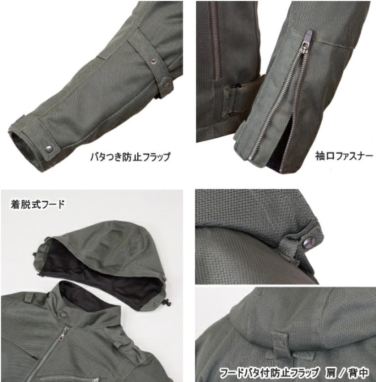 シチュエーションを選ばないさりげないデザインとスリムシルエットにより、バイクを降りたあとでも街に溶け込み行動範囲が広がります。フードは着脱可能でシチュエーションに合わせてスパルタンにもカジュアルにも着こなせます。袖にはバタ付防止及び肘パッドをホールドするアジャストベルト、胸・肩・肘・脊椎にエアスルーパッドをフル装備。耐摩耗性に優れるスパックスメッシュとともにボディをしっかり守ります。オプションの防風インナー(RR7991、RR7987)を併用すれば春先、秋口の着用も可能です。MATERIAL:表地/スパックスメッシュ 裏地/スーパーエアメッシュ襟裏/アイスムースメッシュPROTECTOR:胸・肩・肘・脊椎パッド標準装備 (フルパット仕様)