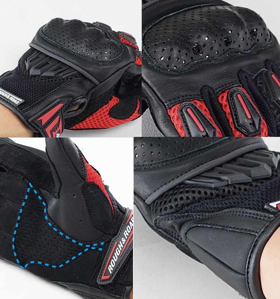 手の甲にラッセルメッシュ生地、手のひら側にはパンチングレザーを採用し、ナックルパッドや甲のパーツにまでベントホールを設けることで抜群の通気性を実現、快適に暑さを凌げるグローブに仕上げました。