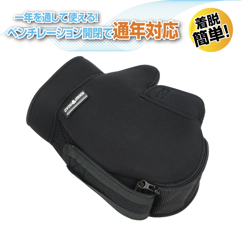簡単取付と幅広い汎用性を兼ね揃えたRR5929ハンドルカバーWIDEに、ファスナー開閉式大型エアベンチレーションを装備し、一年を通して使えるハンドルカバーが登場。冬の寒い時期はベンチレーションを閉めて防寒アイテムとして使用でき、夏や日差しの強い日は側面前方のベンチレーションをワイドに開くと、熱を篭らせずに直射日光を防ぐので日焼け対策としてもおすすめです。また、簡易防滴仕様で突然の雨対策としても効果的です。※ベンチレーションのファスナーは必ず停車時に操作してください。走行中の開閉操作は大変危険です。左右セットMATERIAL:PVC、PVCメッシュ、クロロプレン、ウレタン