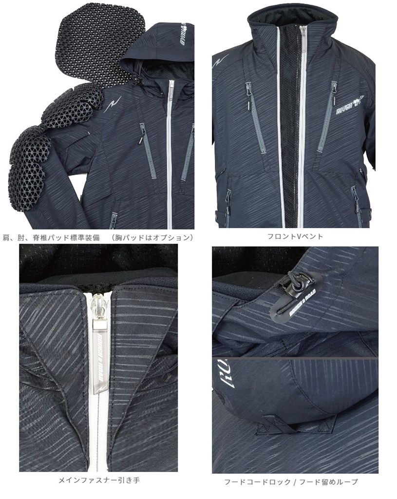 季節気温に合わせてインナージャケット(オプション)も装着でき、また酷暑の夏もフロントVベント、袖ベント、脇ベント、背中ベントと強力なベンチレーション装備でメッシュジャケット並みに涼しく快適なジャケットです。表素材は防風性と高い撥水性のある素材。湿気を放出する透湿性は、ウェア内をドライに保つため快適です。また肩・肘・脊椎パッドも装備され、いざという時の安心感が違います。街着でもツーリングでもキャンプサイトでも、パーカースタイルのためそれぞれのシーンに溶け込みあらゆるシチュエーションで着用できます。MATERIAL:表地/ポリエステル 裏地/ポリエステル 襟裏/ポリエステル(吸汗・速乾)PROTECTOR:肩・肘・脊椎パッド付属