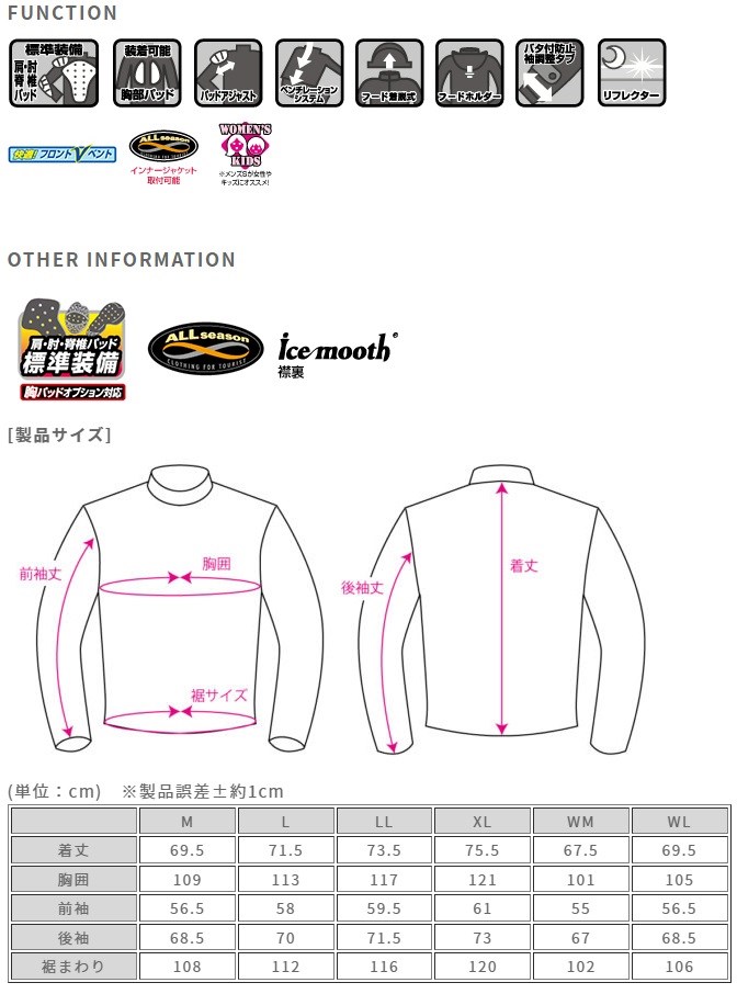 季節気温に合わせてインナージャケット(オプション)も装着でき、また酷暑の夏もフロントVベント、袖ベント、脇ベント、背中ベントと強力なベンチレーション装備でメッシュジャケット並みに涼しく快適なジャケットです。表素材は防風性と高い撥水性のある素材。湿気を放出する透湿性は、ウェア内をドライに保つため快適です。また肩・肘・脊椎パッドも装備され、いざという時の安心感が違います。街着でもツーリングでもキャンプサイトでも、パーカースタイルのためそれぞれのシーンに溶け込みあらゆるシチュエーションで着用できます。MATERIAL:表地/ポリエステル 裏地/ポリエステル 襟裏/ポリエステル(吸汗・速乾)PROTECTOR:肩・肘・脊椎パッド付属