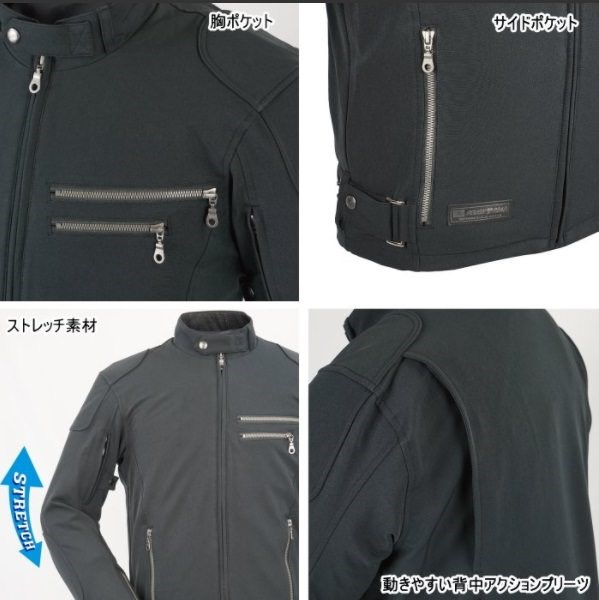 ビンテージ感たっぷりなデザインは時と場所、そしてバイクを選びません。メイン素材にエアスルーソフトシェルを採用し夏場も日差しを遮りつつ程よい通気性があり、風を通しすぎないため、春夏秋と長期間着用可能。プロテクターはエアスルータイプを採用し高い放熱性と通気性を発揮。また、袖ベンチレーション、後ベンチレーションも装備されているため、真夏のライディングも快適です。ストレッチ性のある表素材と、動きやすいライディングフォーム専用の立体裁断によりストレスを感じさせない軽快な着心地です。洗練されたスタイルがコーディネートの幅と、行動範囲をグンと広げてくれます。MATERIAL:表地/ポリエステル 裏地/ポリエステル 襟裏/アイスムースPROTECTOR:肩・肘・脊椎パッド標準装備