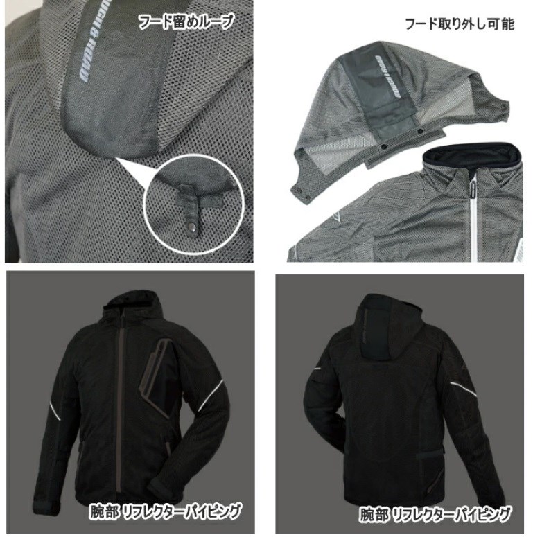 ライディングへの集中を妨げる酷暑からライダーを解放する”究極のメッシュジャケット”のダイレクトエアシリーズにパーカーが登場。着用シーンがより広がりました!ビッグホールメッシュ生地をメインに使用することで、大量のフレッシュエアーを導入しボディをクールダウン。加えて裏地を省くことにより抜群の放熱性を誇り、暑さによる集中力の低下を最小限にします。さらには胸・肩・肘・脊椎にエアスルーパッドを標準マウントし通気性をとことんまで突き詰めた、”放熱”するために生まれた真夏対応のジャケットです。MATERIAL:表地/ビッグホールメッシュ 襟裏/クールマックスメッシュPROTECTOR:胸・肩・肘・脊椎パッド標準装備