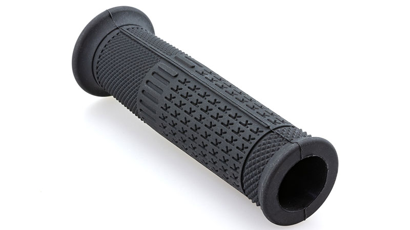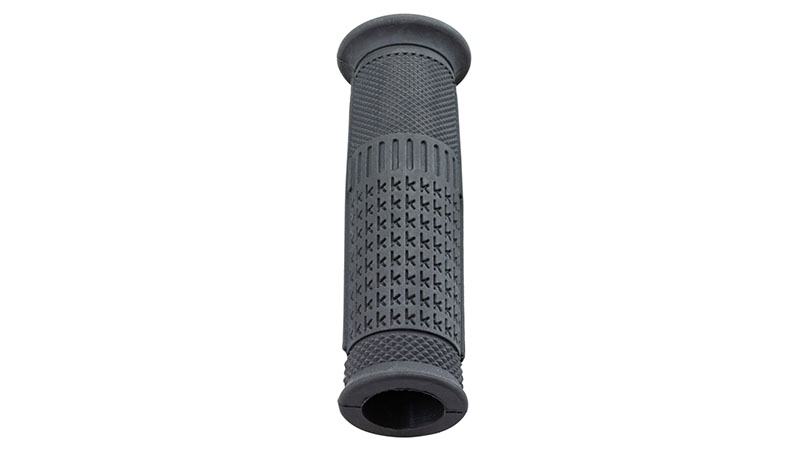 自然な握り心地の樽型形状の表面にピラ山(ピラミッド型の突起)をグリップ両端へ配置、さらには2本のリブを設けることで、握り易く、滑り難い形状を追求したグリップです。加えて、グリップ面中央の"K"のデボス文字により手に馴染みやすい拘りのデザインといたしました。キジマ拘りのスペシャルグリップ"KSPグリップ"の握り心地を体感ください。【サイズ】全長:120mm 最大径:約33mm(リブ部)内径:22.2mm(左側用)/25.4mm(右側用)【エンドタイプ】貫通【色】ブラック【材質】EPDM【硬度】40°