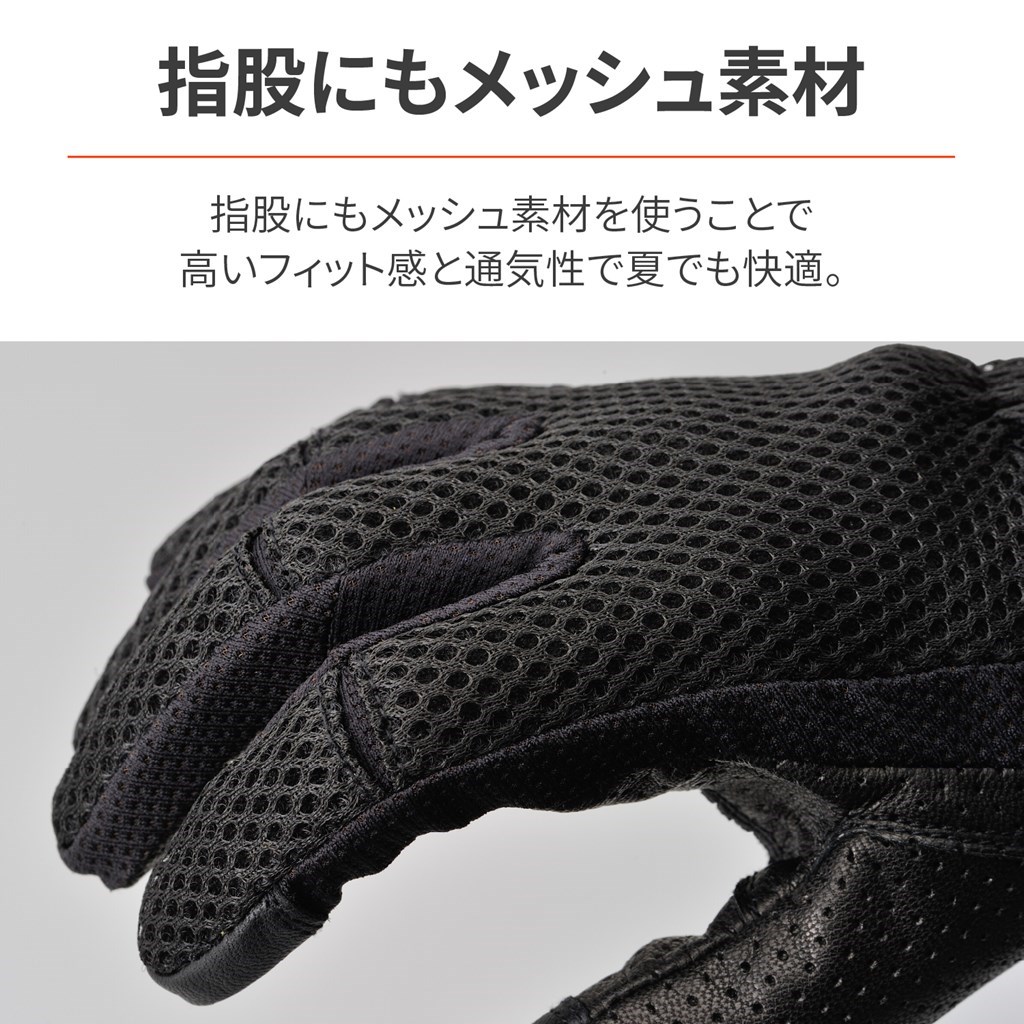フルメッシュ+本革で通気性と耐久性を両立させた春夏グローブ。手の甲側は通気性とストレッチ性に優れたメッシュ素材、手の平側は全面パンチング加工を施した本革を採用。指股には通気性に優れるストレッチ素材を採用することで、高いフィット感、通気性と安全性を両立。手の平に本革を採用することにより、転倒やグリップによる摩耗を防ぎ耐久性を確保しています。真夏でも快適にライディングできます。シーズン:春夏通気性の高いメッシュ素材を多面に使用ストレッチ性の優れたメッシュ生地で握りやすい転倒やグリップとの摩耗を考慮して手の平に本革採用タッチパネル対応※手とグローブの密着度によりタッチパネルの感度は異なります。