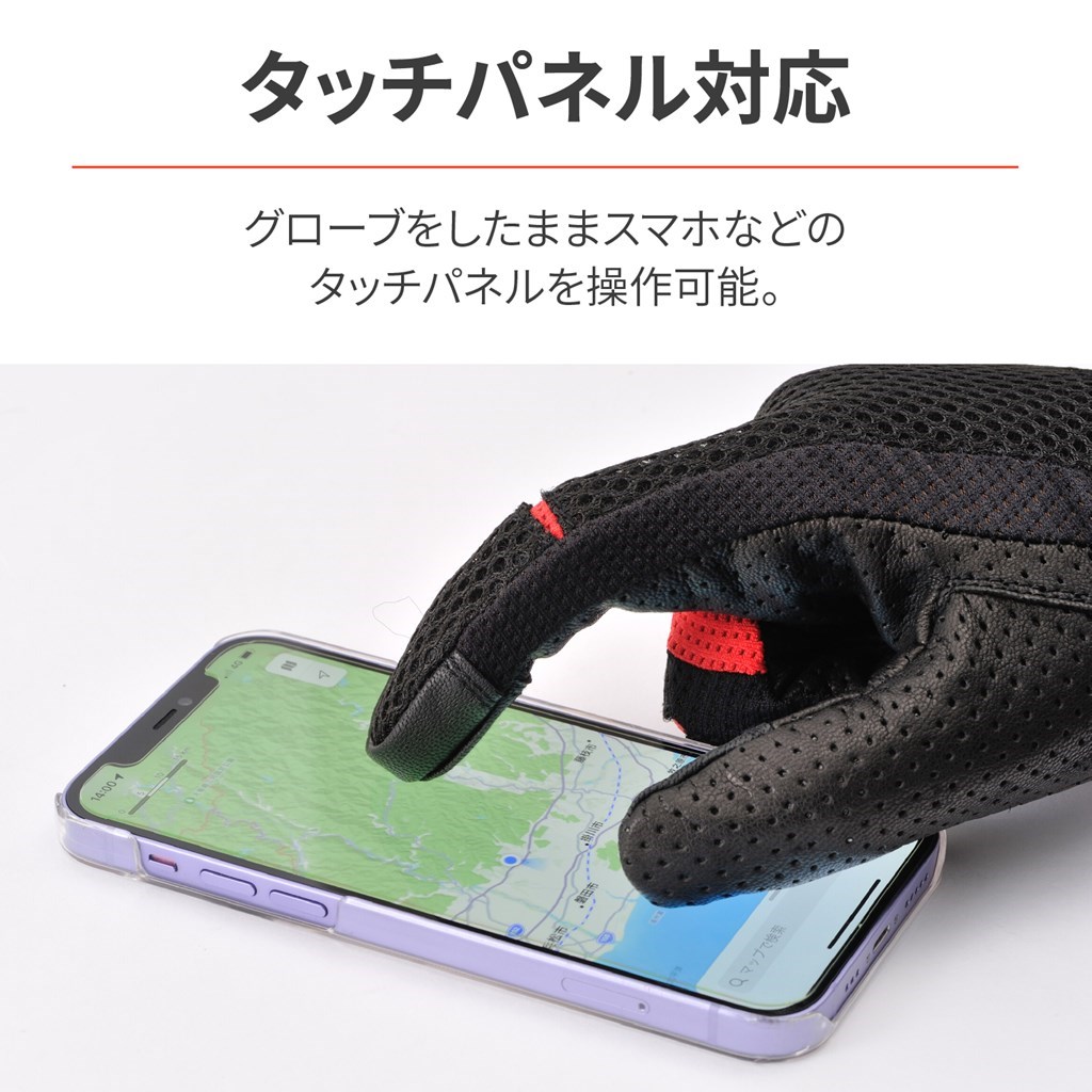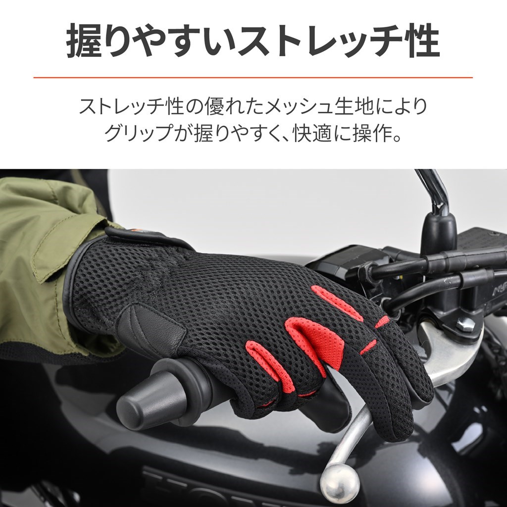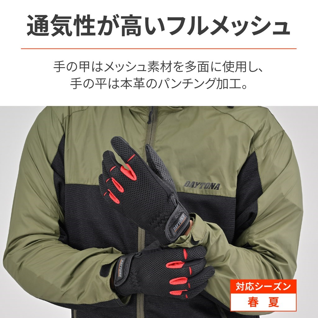 フルメッシュ+本革で通気性と耐久性を両立させた春夏グローブ。手の甲側は通気性とストレッチ性に優れたメッシュ素材、手の平側は全面パンチング加工を施した本革を採用。指股には通気性に優れるストレッチ素材を採用することで、高いフィット感、通気性と安全性を両立。手の平に本革を採用することにより、転倒やグリップによる摩耗を防ぎ耐久性を確保しています。真夏でも快適にライディングできます。シーズン:春夏通気性の高いメッシュ素材を多面に使用ストレッチ性の優れたメッシュ生地で握りやすい転倒やグリップとの摩耗を考慮して手の平に本革採用タッチパネル対応※手とグローブの密着度によりタッチパネルの感度は異なります。