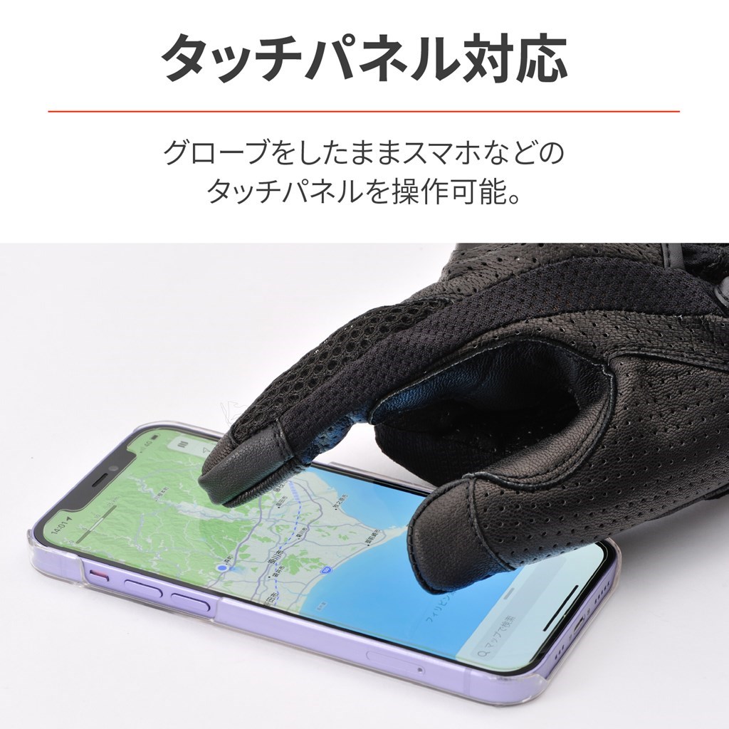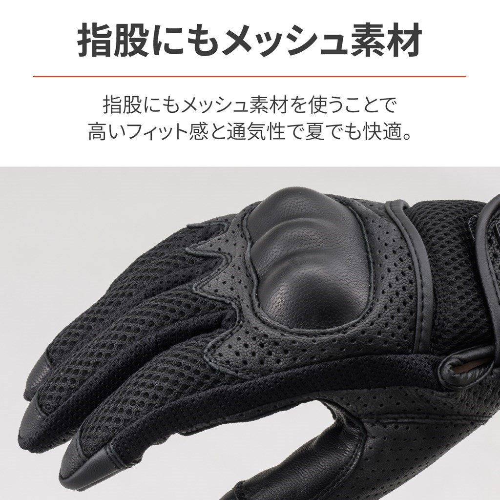 フルメッシュ+本革で通気性と耐久性を両立させた春夏グローブ。手の甲側は通気性とストレッチ性に優れたメッシュ素材、手の平側は全面パンチング加工を施した本革を採用。指股には通気性に優れるストレッチ素材を採用することで、高いフィット感、通気性と安全性を両立。手の平に本革を採用することにより、転倒やグリップによる摩耗を防ぎ耐久性を確保しています。真夏でも快適にライディングできます。ハードナックルプロテクターがプロテクション効果を高め、フローティング構造によりグリップが握りやすく快適に操作できます。シーズン:春夏通気性の高いメッシュ素材を多面に使用ストレッチ性の優れたメッシュ生地で握りやすい転倒やグリップとの摩耗を考慮して手の平に本革採用タッチパネル対応※手とグローブの密着度によりタッチパネルの感度は異なります。