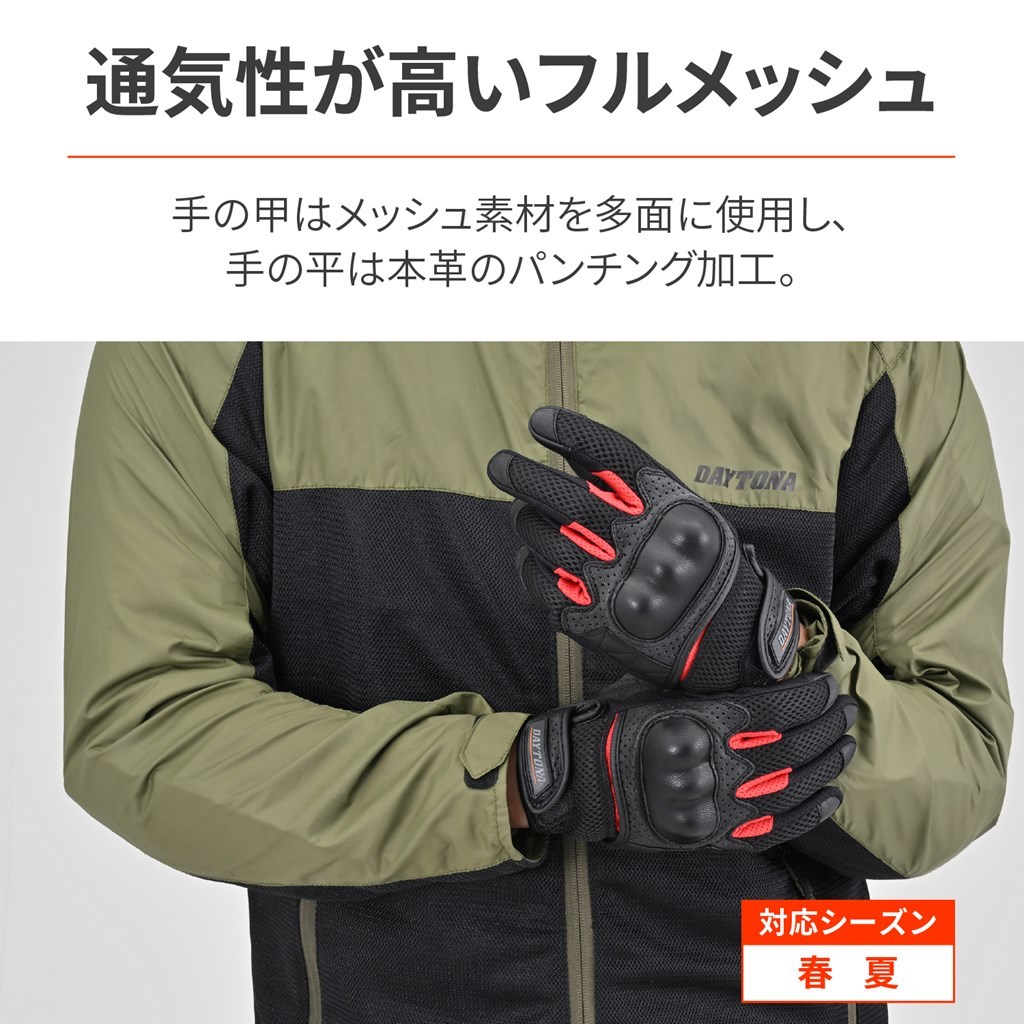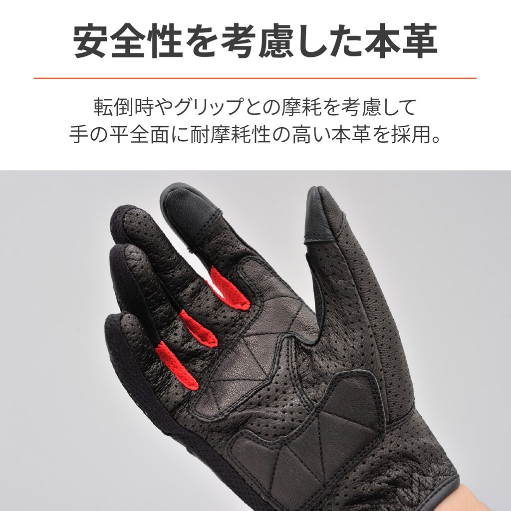 フルメッシュ+本革で通気性と耐久性を両立させた春夏グローブ。手の甲側は通気性とストレッチ性に優れたメッシュ素材、手の平側は全面パンチング加工を施した本革を採用。指股には通気性に優れるストレッチ素材を採用することで、高いフィット感、通気性と安全性を両立。手の平に本革を採用することにより、転倒やグリップによる摩耗を防ぎ耐久性を確保しています。真夏でも快適にライディングできます。ハードナックルプロテクターがプロテクション効果を高め、フローティング構造によりグリップが握りやすく快適に操作できます。シーズン:春夏通気性の高いメッシュ素材を多面に使用ストレッチ性の優れたメッシュ生地で握りやすい転倒やグリップとの摩耗を考慮して手の平に本革採用タッチパネル対応※手とグローブの密着度によりタッチパネルの感度は異なります。