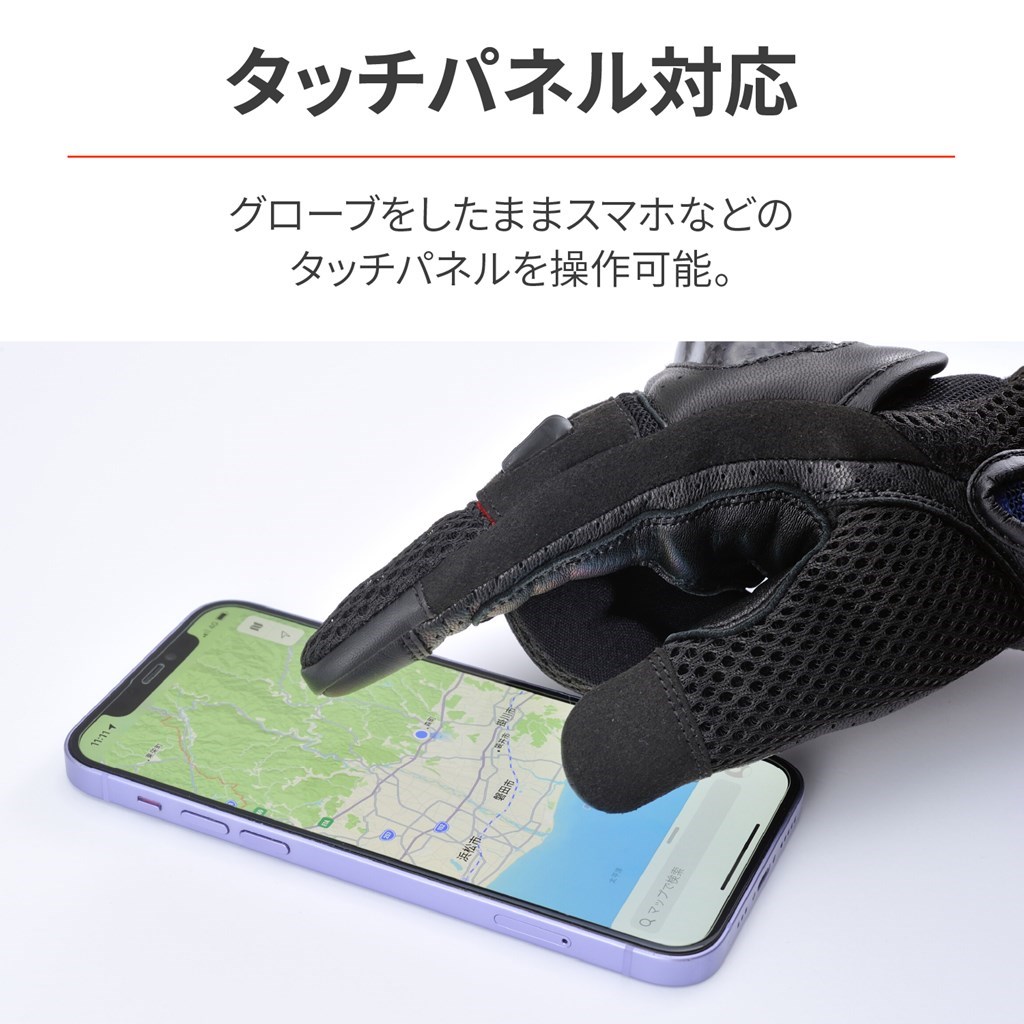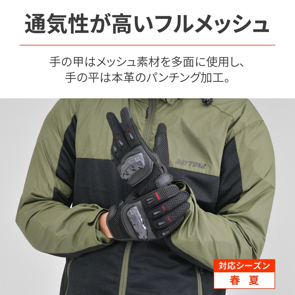 メッシュ+本革で通気性と耐久性を両立させた春夏グローブ。手の甲側は通気性に優れたメッシュ素材、手の平側は全面パンチング加工を施した本革を採用。指股にはストレッチ素材を採用することで、ソフトな装着感で通気性と安全性を両立。手の平に本革を採用することにより、転倒やグリップによる摩耗を防ぎ耐久性を確保しています。真夏でも快適にライディングできます。カーボンナックルプロテクターがプロテクション効果を高め、フローティング構造によりグリップが握りやすく快適に操作できます。シーズン:春夏通気性の高いメッシュ素材を多面に使用ストレッチ性の優れたメッシュ生地で握りやすい転倒やグリップとの摩耗を考慮して手の平に本革採用タッチパネル対応※手とグローブの密着度によりタッチパネルの感度は異なります。