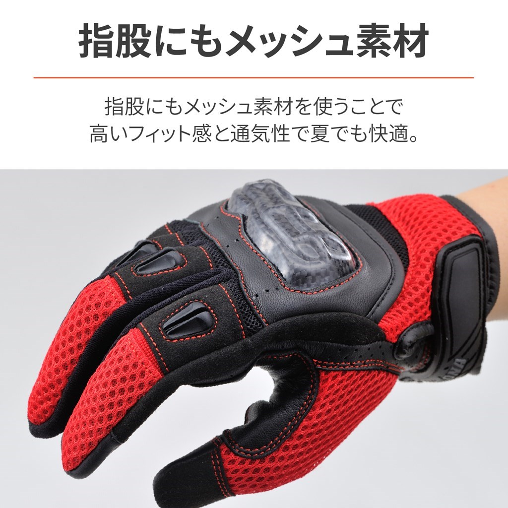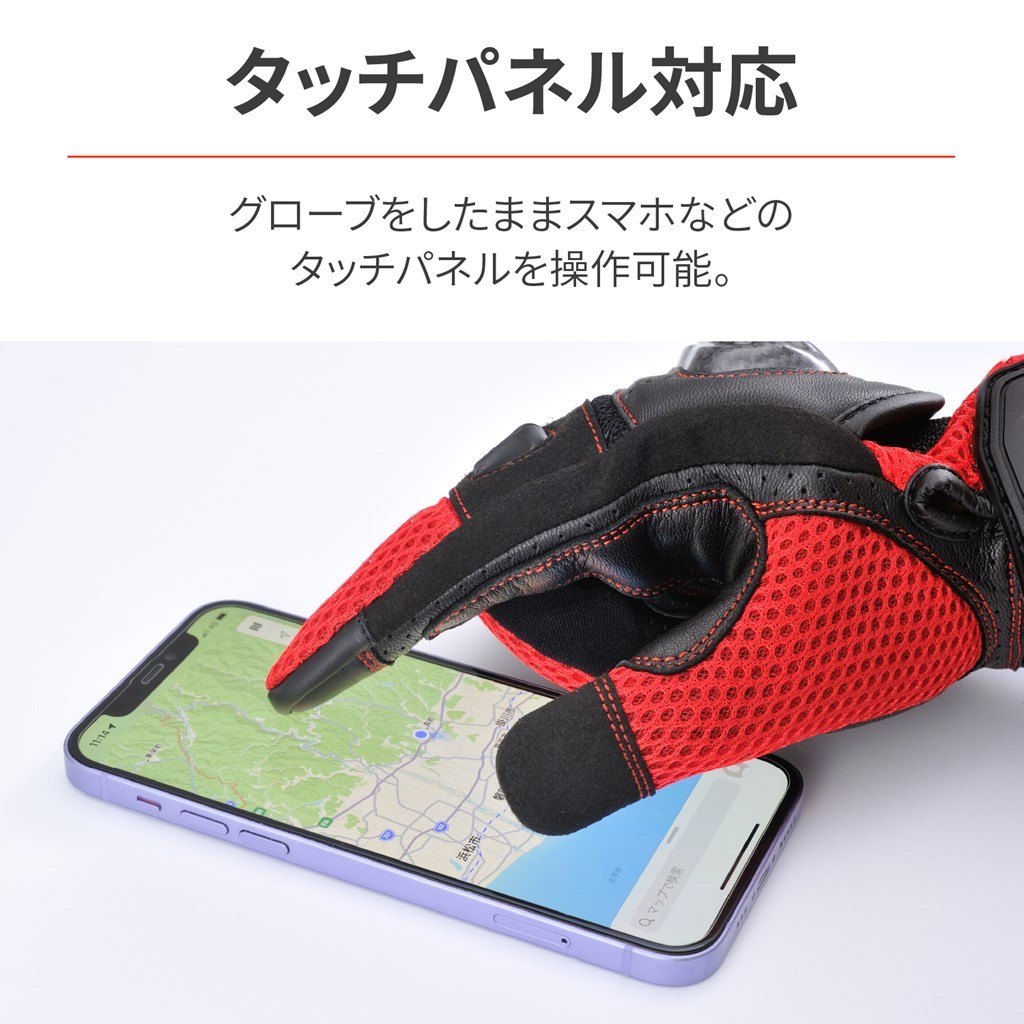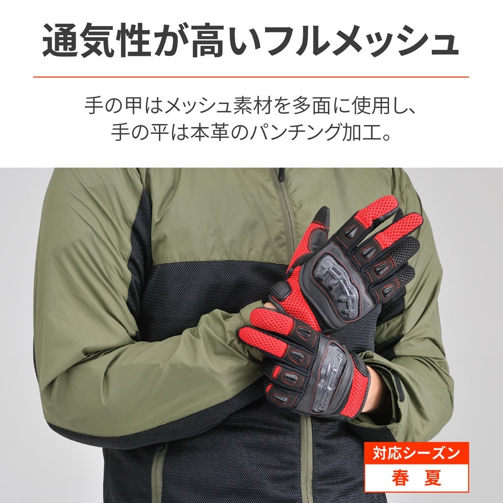 メッシュ+本革で通気性と耐久性を両立させた春夏グローブ。手の甲側は通気性に優れたメッシュ素材、手の平側は全面パンチング加工を施した本革を採用。指股にはストレッチ素材を採用することで、ソフトな装着感で通気性と安全性を両立。手の平に本革を採用することにより、転倒やグリップによる摩耗を防ぎ耐久性を確保しています。真夏でも快適にライディングできます。カーボンナックルプロテクターがプロテクション効果を高め、フローティング構造によりグリップが握りやすく快適に操作できます。シーズン:春夏通気性の高いメッシュ素材を多面に使用ストレッチ性の優れたメッシュ生地で握りやすい転倒やグリップとの摩耗を考慮して手の平に本革採用タッチパネル対応※手とグローブの密着度によりタッチパネルの感度は異なります。