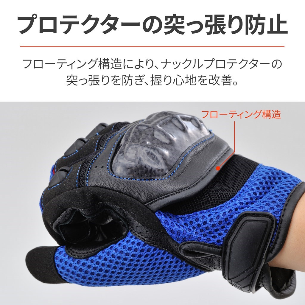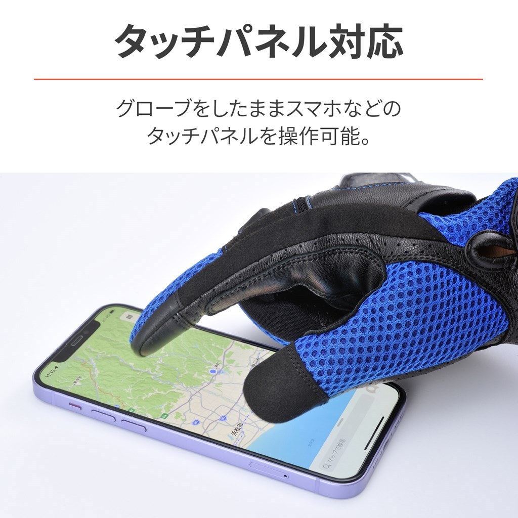 メッシュ+本革で通気性と耐久性を両立させた春夏グローブ。手の甲側は通気性に優れたメッシュ素材、手の平側は全面パンチング加工を施した本革を採用。指股にはストレッチ素材を採用することで、ソフトな装着感で通気性と安全性を両立。手の平に本革を採用することにより、転倒やグリップによる摩耗を防ぎ耐久性を確保しています。真夏でも快適にライディングできます。カーボンナックルプロテクターがプロテクション効果を高め、フローティング構造によりグリップが握りやすく快適に操作できます。シーズン:春夏通気性の高いメッシュ素材を多面に使用ストレッチ性の優れたメッシュ生地で握りやすい転倒やグリップとの摩耗を考慮して手の平に本革採用タッチパネル対応※手とグローブの密着度によりタッチパネルの感度は異なります。