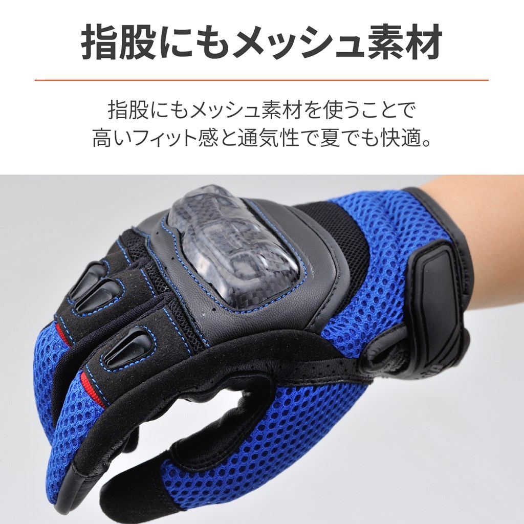 メッシュ+本革で通気性と耐久性を両立させた春夏グローブ。手の甲側は通気性に優れたメッシュ素材、手の平側は全面パンチング加工を施した本革を採用。指股にはストレッチ素材を採用することで、ソフトな装着感で通気性と安全性を両立。手の平に本革を採用することにより、転倒やグリップによる摩耗を防ぎ耐久性を確保しています。真夏でも快適にライディングできます。カーボンナックルプロテクターがプロテクション効果を高め、フローティング構造によりグリップが握りやすく快適に操作できます。シーズン:春夏通気性の高いメッシュ素材を多面に使用ストレッチ性の優れたメッシュ生地で握りやすい転倒やグリップとの摩耗を考慮して手の平に本革採用タッチパネル対応※手とグローブの密着度によりタッチパネルの感度は異なります。