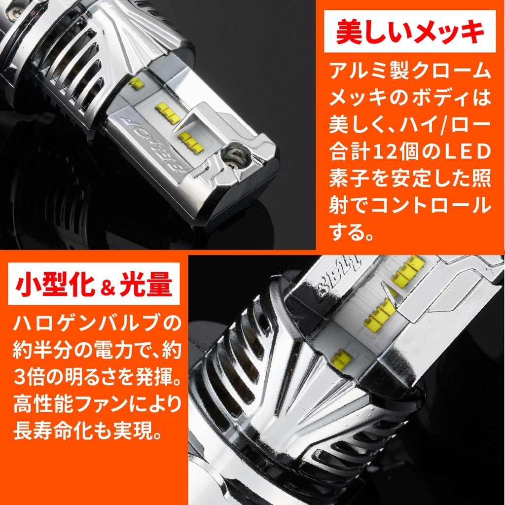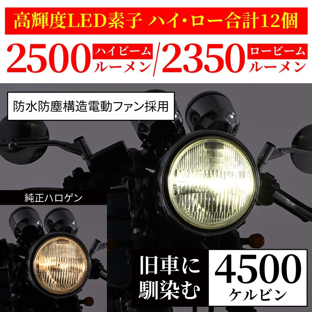ハロゲンバルブからLEDライトへ手軽にアップグレード。Hi/Low両面合計で12個のLED素子を採用することで、Hiビーム2500ルーメン/Lowビーム2350ルーメンを実現。信頼のルミレッズ社製高輝度LED素子を採用し、バルブのさらなる小型化と光量アップを両立。ハロゲンバルブ約半分の電力で約3倍の明るさを発揮し、従来品のプレシャス・レイ Xに比べ、更なる小型化と光量アップも達成。多層冷却ヒートシンクと高性能ファンで効率的に放熱することで長寿命も実現しました。寸法はハロゲンバルブ同等なので、装着は純正バルブと差し替えるだけで、簡単に装着できます。旧車になじむ4500ケルビンです。【安心の車検対応】適合確認は、車検検査の際に使用されているヘッドライトテスターと同等品を社内設備として導入し、標準状態との光量比較や配光状態の確認を行なっています。本テスターにて光軸調整を行ない運輸支局へ車両を持ち込み検査登録を行なう車両もあります。ヘッドライトテスターの配光状態(明るさの数字等)と実際に地面を照らす光は必ず一致するものではありません。デイトナでは、ヘッドライトテスター検査(調整)の後、社内コースや裏路地等を夜間走行し、照射範囲の確認も行なっています。ハロゲンバルブから差し替えるだけでLED化。旧車になじむ4500ケルビン高輝度LED素子を両面合計12個配置。明るさはハイ2500ルーメン/ロービーム2350ルーメンアルミ製クロームメッキボディをハロゲンバルブと同等サイズで実現雨でも安心の防水防塵構造(IP65)消費電力はハイ/ロー共に24W相当※この商品は、ハロゲンバルブ採用の直流(DC)12V二輪車専用品です。6Vや交流(AC)の二輪車には使用できません。※購入前に取り付け車種とバルブ形状が一致していること、寸法図を参考にヘッドライトケース内に取付スペースが確保されていることをよくご確認ください。純正バルブシェード採用車はシェードまでの距離の確認も必要です。車両によっては純正バルブシェードの取り外しが必要です。※輸入外車へ装着された場合、消費電力の違いから車体側のシステムが作動し球切れ警告灯が点灯する場合があります。※個々によって色味が若干異なります。