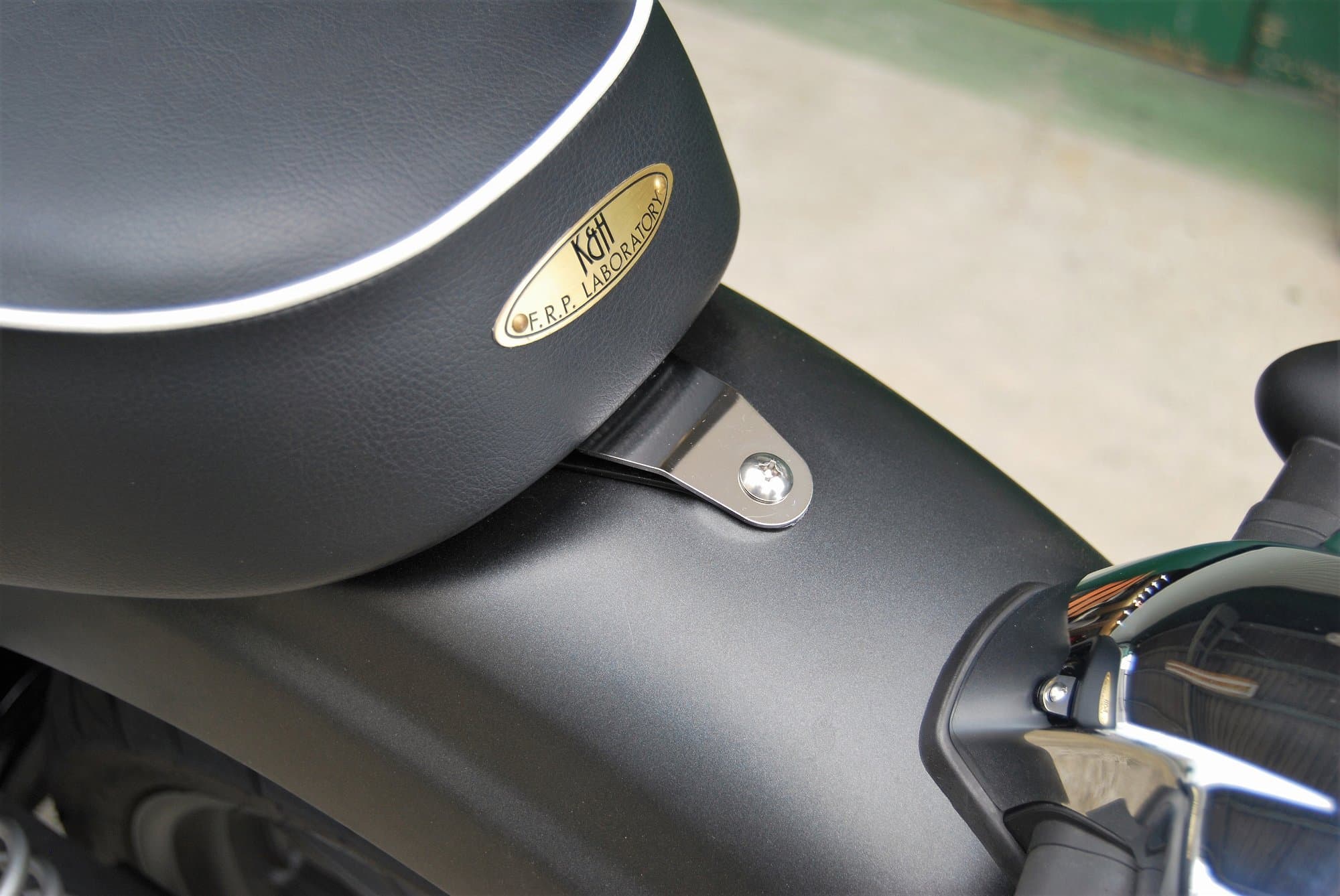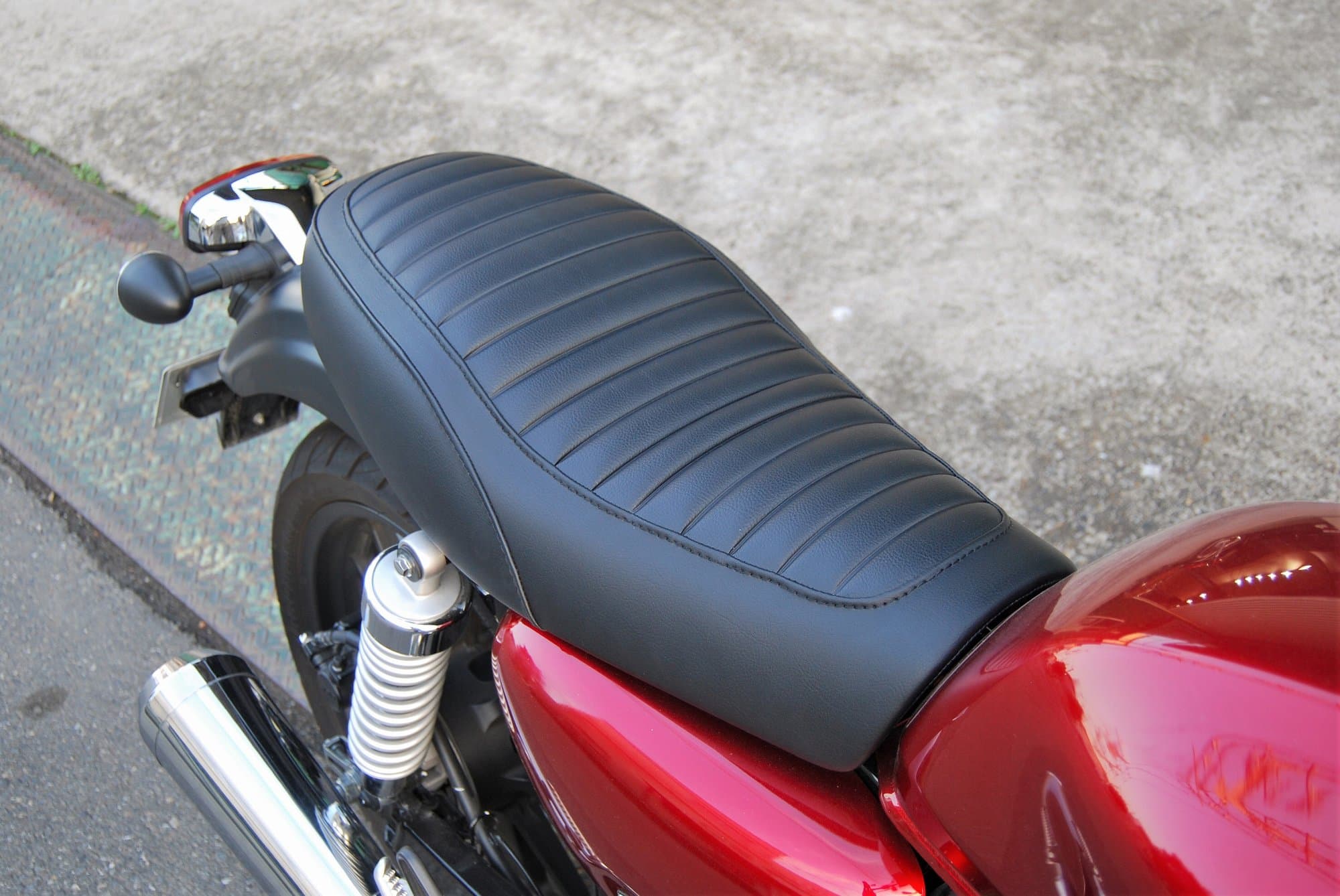純正シート比+1cm座面が高くなりますが、足を下す際の内腿に当たる部分の形状を工夫することにより、純正シートとほぼ同等の足つきを実現しています。座面が水平近く前後に広いのでポジションを自由に決められます。着座位置が高くなるので膝の曲がりが緩やかになり、立ち姿勢に近くなることでよりステップ荷重での車体操作がし易くなります。ステップ荷重が増え、相対的にお尻(シート)への荷重が減り負担が軽減されます。特徴:座面中央のタックロール含めレザー全体にプレーンブラックを使用し、縫い合わせのラインはステッチで仕上げています。ステッチラインが途中弧を描いて下に落ちるBタイプです。パッセンジャー側のシートベース下にETCを収められるほどのスペースを確保してあります。シートベースからK&H社オリジナルの専用設計で、取り付けは純正シート同様ボルトオンです。純正シートから付け替えてご使用になれます。※純正シートの取り付け方法から変更になる社外リアフェンダーとの併用不可※仕様はすべて標準の仕様になります。