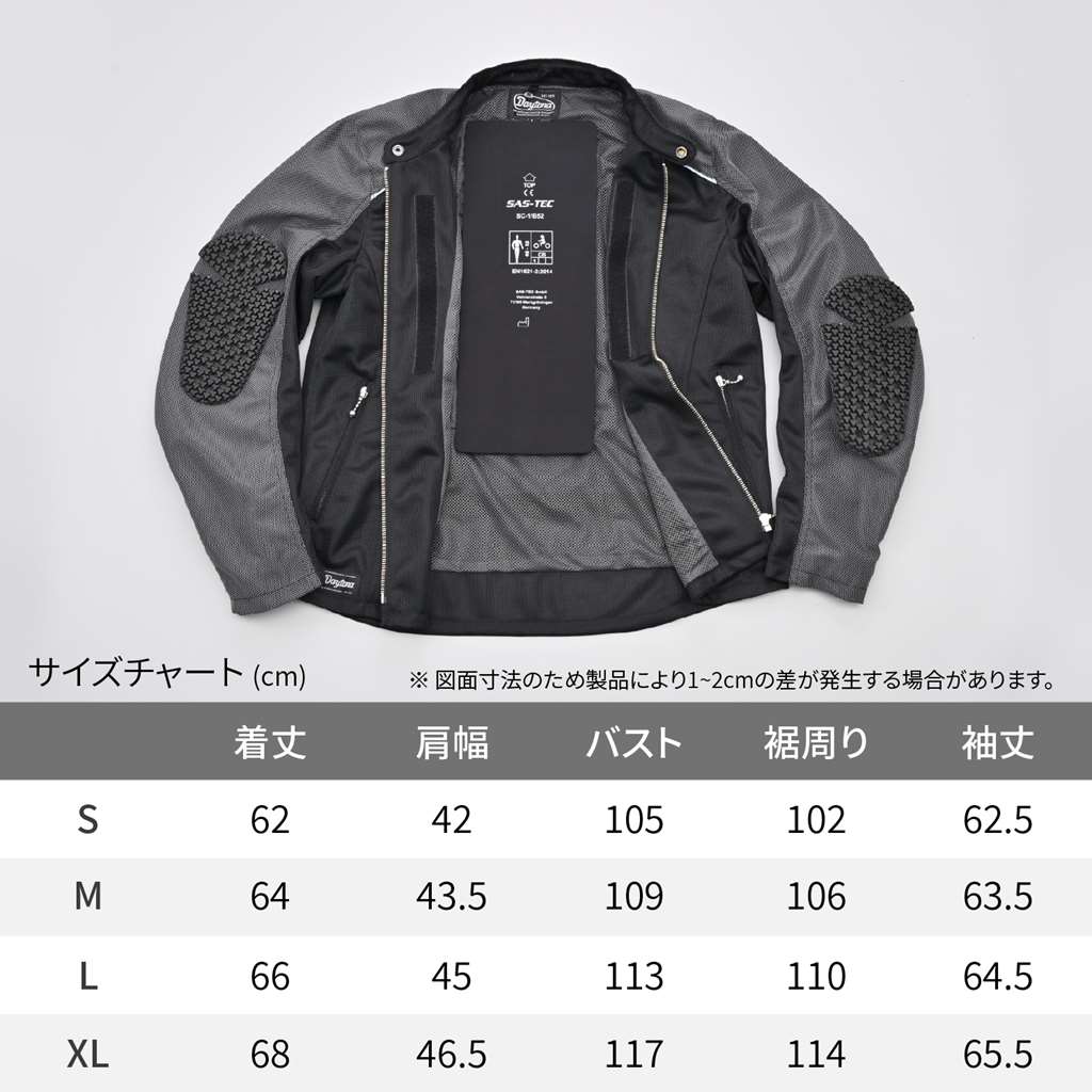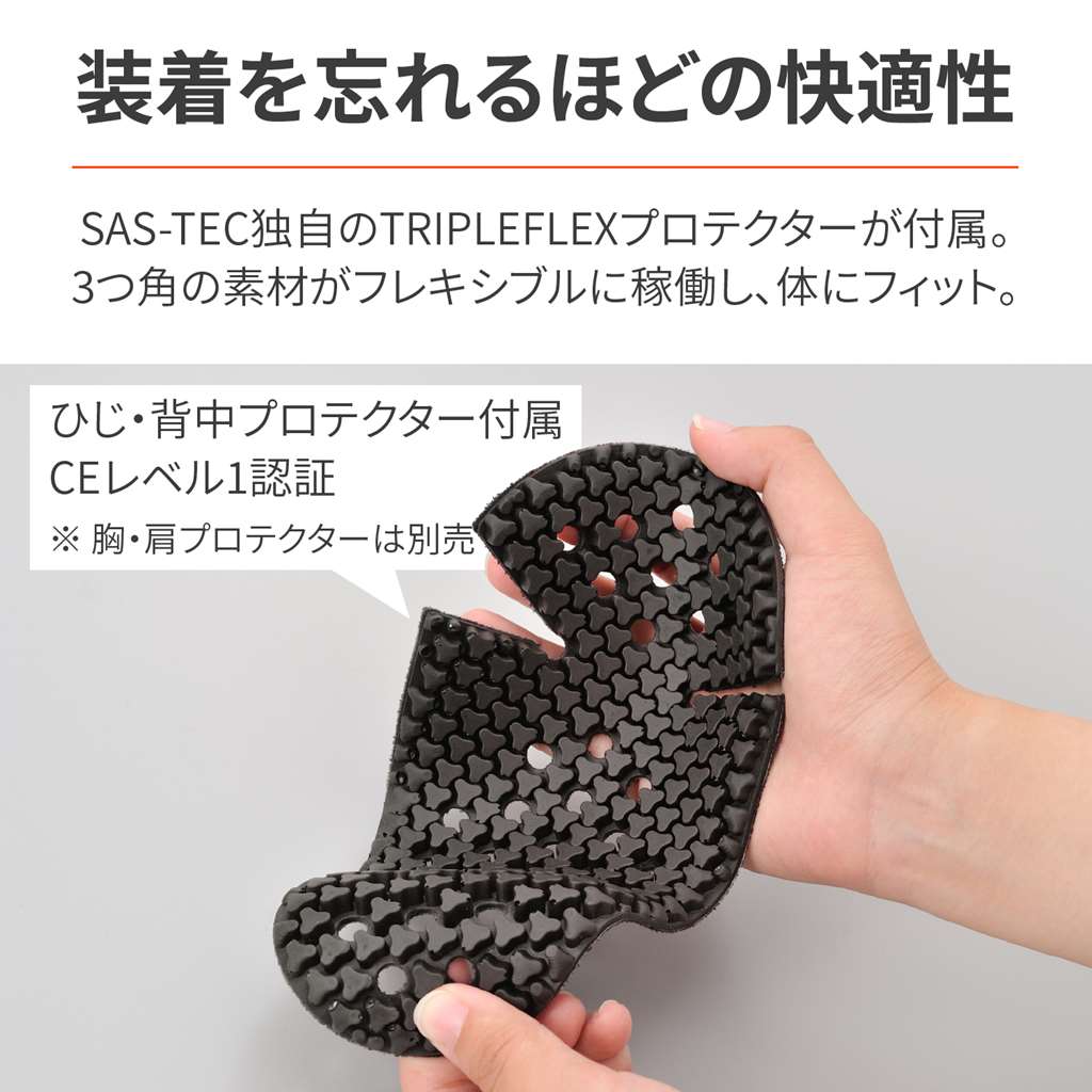 真夏の快適性を求めたシンプルなシングルライダース風デザインのフルメッシュジャケット。ライディングポジションを考慮し、腕の位置や角度は前よりに、後身頃の裾は長くとっているためセパハンユーザーにもおすすめです。ひじ、背中のプロテクターは、SAS-TECのTRIPLEFLEXタイプを標準装備。CE規格をクリアした安全性と、体にフィットする装着感の良いプロテクターが付属。胸部はCPS規格のプロテクターが装着できます。シーズン:春夏夏に快適なフルメッシュジャケット。全面にメッシュ素材を使って快適な風を取り込みひじ、背中プロテクター:SAS-TECのTRIPLEFLEXタイプを装備CE規格をクリアした安全性と、体にフィットする装着感の良いプロテクターが付属胸部はCPS規格のプロテクターに対応※図面寸法のため製品により1-2cmの差が発生する場合があります。