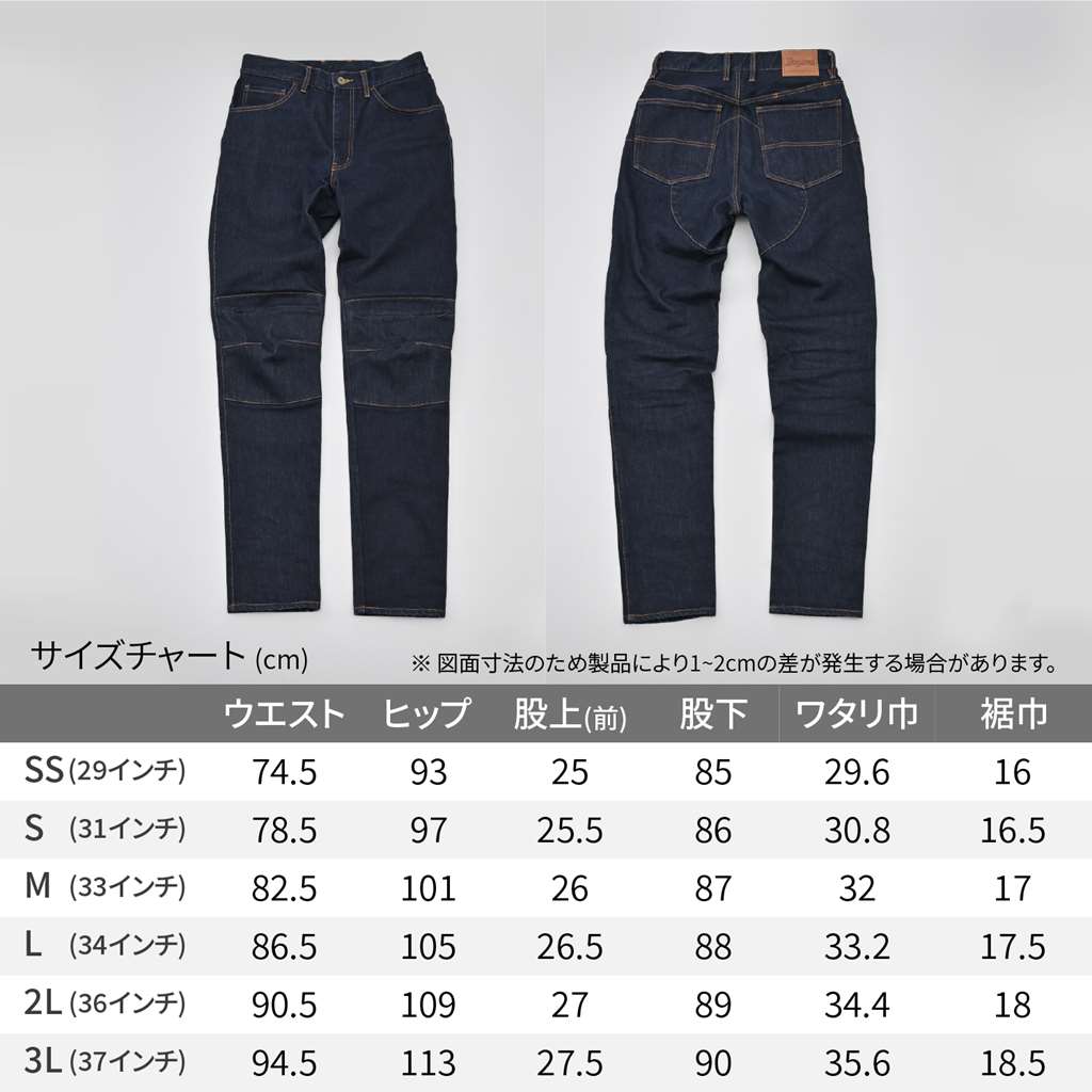 16ozの厚手コーデュラ生地を採用し高強度、耐摩耗性、耐引裂性に優れた寿命の長い厚手のストレートカットジーンズ。膝プロテクターポケットは外側に設置し、足の入れやすさ、履きやすさとプロテクターの外しやすさを重視。股下はバイクにまたがりやすくライディング姿勢にフィットする形状かつ、直立時も綺麗に見えるシルエットに仕上げました。ひざのプロテクターは、SAS-TECのTRIPLEFLEXタイプを標準装備。CE規格をクリアした安全性と、体にフィットする装着感の良いプロテクターが付属。シーズン:春夏秋16ozの厚手コーデュラ生地を採用した高強度、耐摩耗性、耐引裂性に優れた長寿命ジーンズバイクにまたがりやすくライディング姿勢にフィットする形状ひざプロテクター:SAS-TECのTRIPLEFLEXタイプを装備CE規格をクリアした安全性と、体にフィットする装着感の良いプロテクターが付属※図面寸法のため製品により1-2cmの差が発生する場合があります。